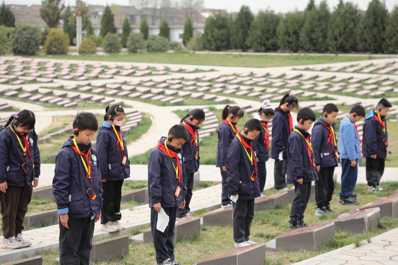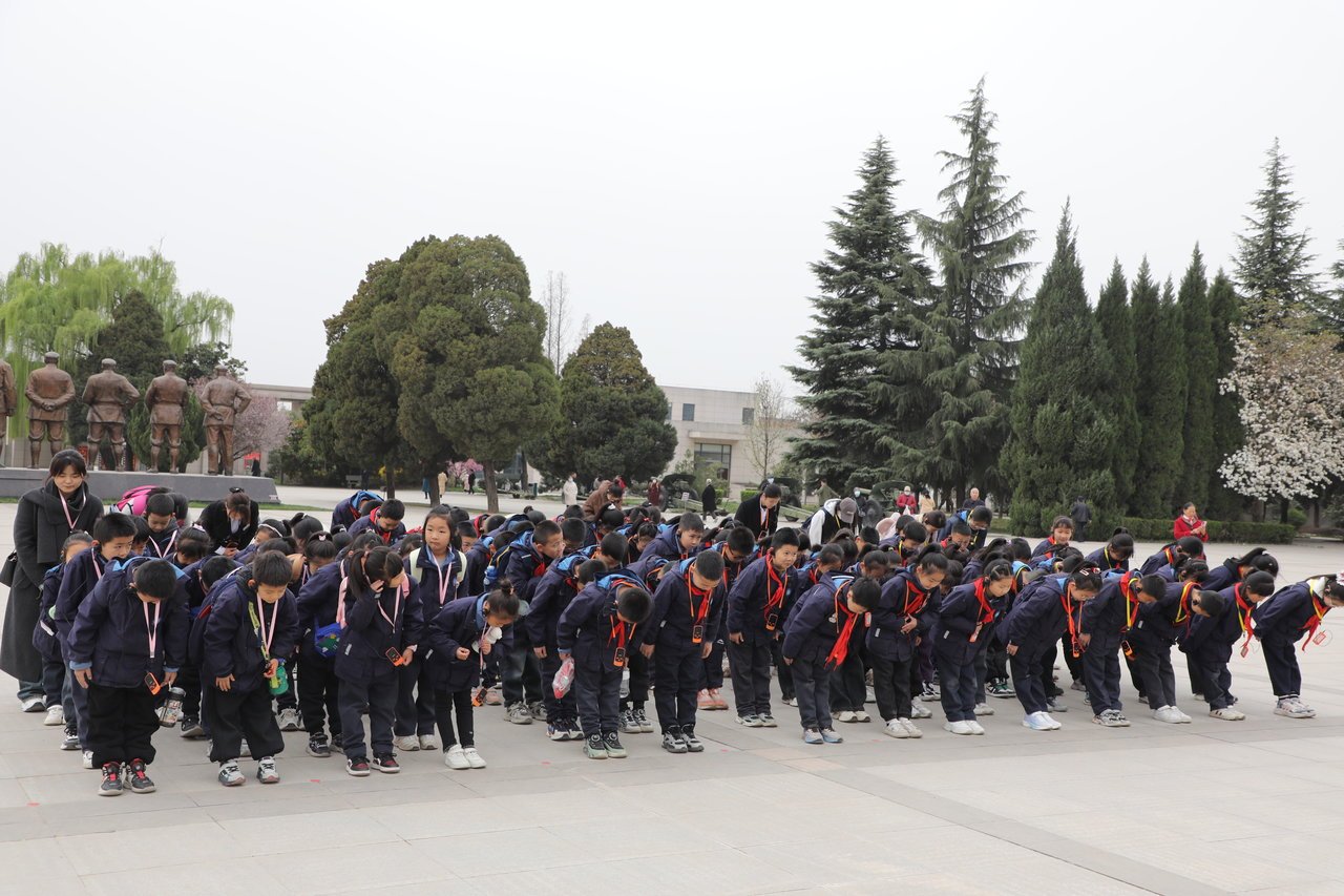 在扶眉战役纪念馆烈士纪念碑前,少先队员白子楠、宋卓雅手捧白菊敬献花篮,全体师生垂首默哀。馆内锈迹斑驳的军用水壶、泛黄战地日记等300余件文物,配合全息投影重现的烽火场景,学生代表赵涵蕾在发言中写道:“原来课本里‘抛头颅洒热血’的句子,是先烈们用体温焐热的真实人生。”学生们手持软布轻拭烈士墓碑,指尖触到的每一道刻痕都成为无声的历史教科书。