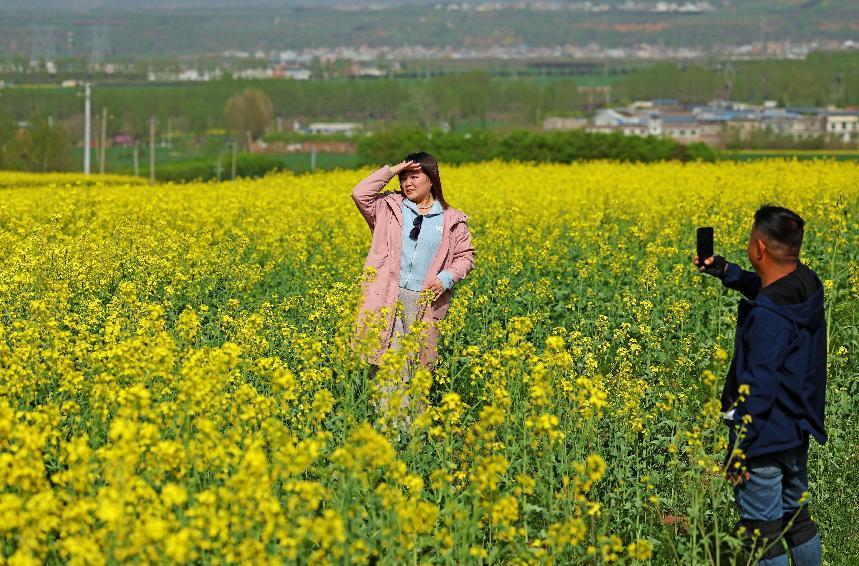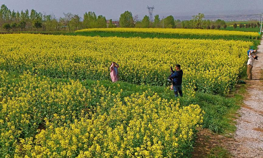 三秦都市报-三秦网讯(记者 代泽均)4月8日,西安市长安区杨庄的油菜花正值盛放期,随着阵阵花香,放眼望去,游客徜徉在油菜花芬芳的花海中,拍照留念,享受春天的美景。