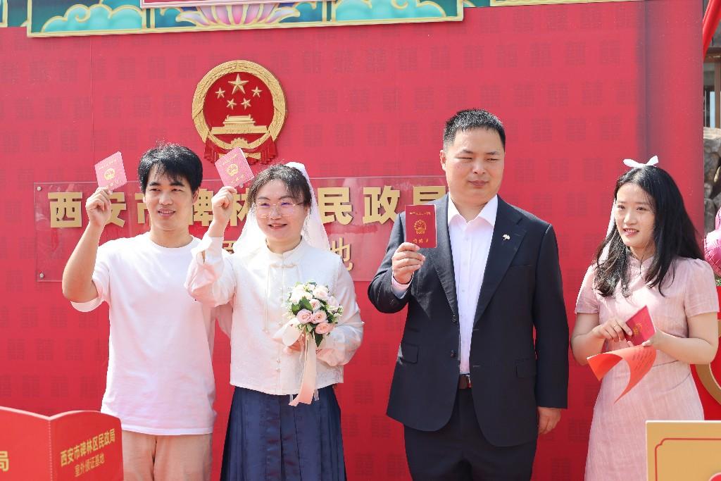 三秦都市报-三秦网讯(记者 成东丽)4月20日,碑林区民政局在风景如画的户外颁证基地,为新人举办了一场别开生面的“春满碑林 爱在四月”集体婚礼。这场简约而浪漫的仪式,不仅见证了新人们的爱情誓言,更成为倡导婚俗改革的一道亮丽风景线。