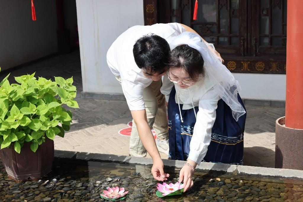 在“爱的告白”环节,新人们深情相望,在春风的见证下向彼此倾诉心底最真挚的爱意。“亲爱的,我不要天价彩礼,只要你的真心相伴。”新娘杨女士的一番告白让在场所有人动容。95后新人周先生坦言:“简约婚礼不仅减轻了经济负担,更让我们能专注于爱情本身。”最引人注目的是“月老送祝福”环节。身着传统服饰的月老手持红线,为新人们送上“勤俭持家”“相敬如宾”等美好祝愿。这一创新设计既传承了中华民族传统婚俗文化,又赋予了新的时代内涵,获得新人的一致好评。