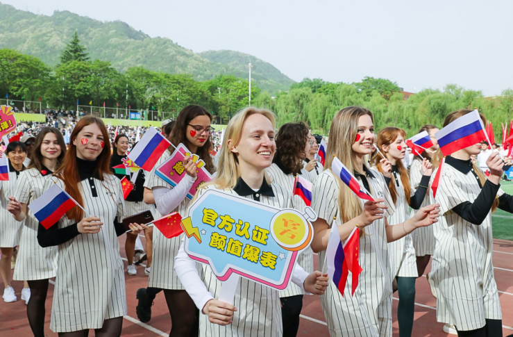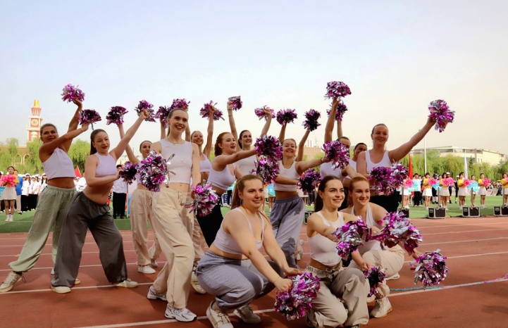 当激昂的《运动员进行曲》奏响,国际交流学院方阵迈着自信而整齐的步伐通过主席台。50余名来自俄罗斯的留学生身着运动装,手中高举着本国国旗与中国国旗,与现场的中国同学相映成趣。俄罗斯留学生们别出心裁地在脸上贴着小巧精致的五星红旗贴纸,贴纸在阳光的照耀下闪烁着光芒,仿佛是他们心中对中国热爱之情的具象化。他们脸上洋溢着兴奋与自豪的笑容,灿烂而温暖,构成了一道独特风景线。