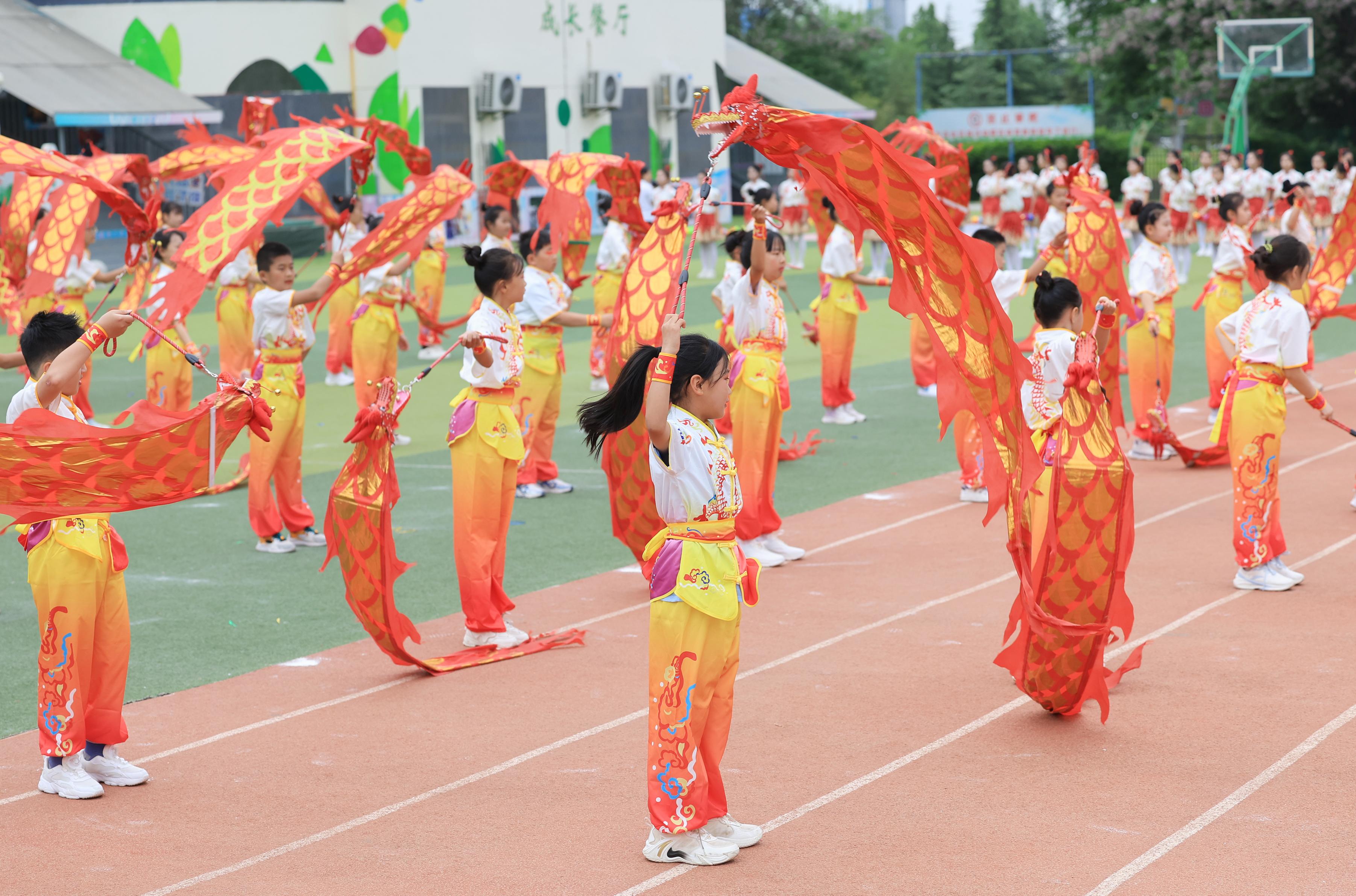 当团体操表演的音乐响起,整个运动场瞬间化作艺术与体育交融的舞台。各年级创意展演惊艳全场:一年级萌童手持七彩绳演绎《绳舞飞扬 萌娃初绽》,稚嫩身影跳跃出生命的律动;二年级《律动棒篮》将篮球韵律与接力竞技完美融合;三年级彩带操《炫彩少年 快乐悦动》展示了运动带来的快乐和活力;四年级学生以哪吒为原型,将传统文化符号注入现代体育展演;五年级《彩龙舞东方》、六年级《最美中国戏》更是将戏曲身段与体操技巧创新结合,赢得现场热烈掌声。每个方阵都经过师生精心编排,既展现体育之美,更传递文化自信。