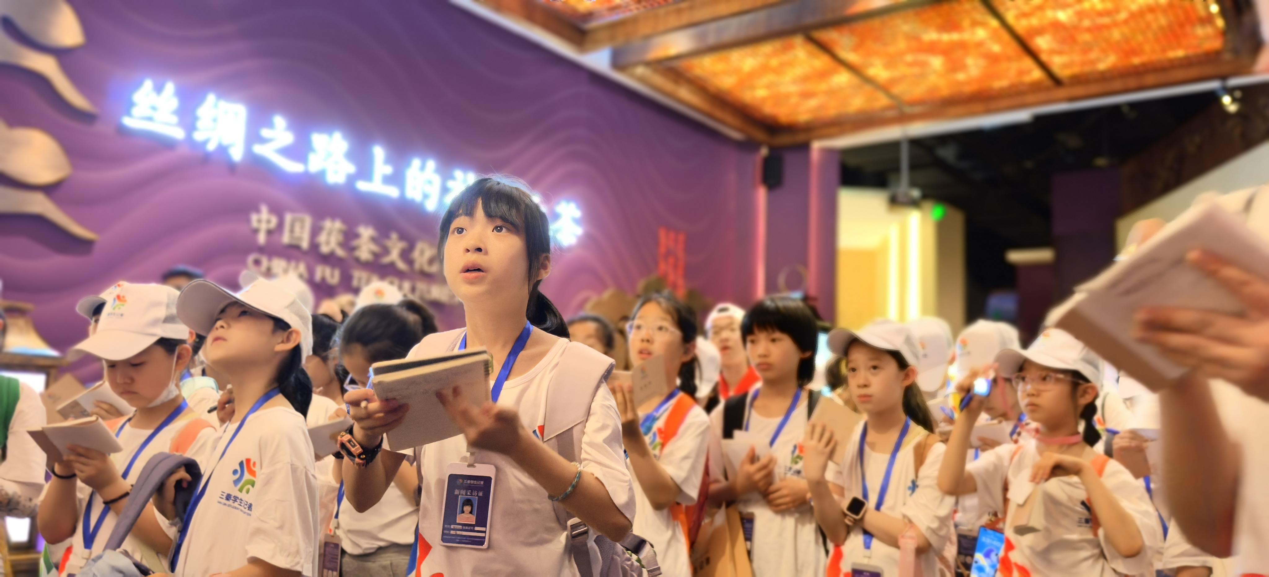 三秦都市报-秦闻讯(记者 王顺)“原来茶叶里能开出金花!”“这块茶砖比我爷爷年纪还大!”4月26日,中国茯茶文化博物馆内,50余名“三秦学生记者”穿梭在千年茶香中。西安市浐灞第三小学“名校+”的师生们将思政课堂搬进茯茶非遗一线,通过“触摸历史+实战采访”解锁传统文化密码,在青砖金花间书写新时代少年的文化担当。
