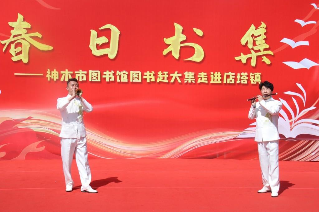 清晨的店塔农贸集市,因为读书摊、换书摊、赠书摊的出现,展现出新的活力:舞台上,歌伴舞、笛子唢呐独奏、陕北民歌、舞蹈等精彩节目轮番上演,让众多市民围观分享。节目中穿插的“对诗诵读”环节,更吸引了过路读者驻足参与。