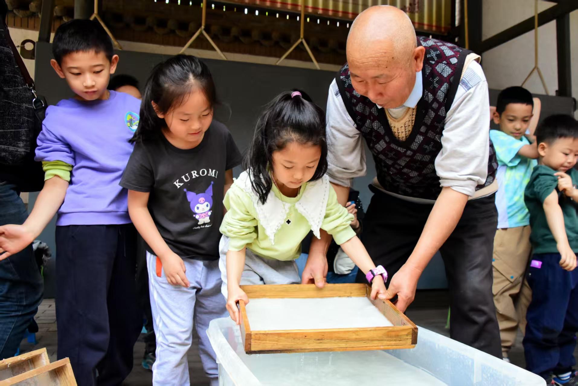 在体验环节,北张村古法造纸非遗项目的国家级传承人马松胜师傅给孩子们演示操作步骤,带领孩子们实际操作,体验古法造纸。孩子们全神贯注,跃跃欲试,手拿抄纸框、下水搅浆形成浆水,学着马师傅的样子,将抄纸框伸进浆水中左右均匀晃动、捞浆,轻轻地提起,纸浆在捞纸器上交织成薄片状的湿纸,完成抄纸。最后通过晾晒形成宣纸。
