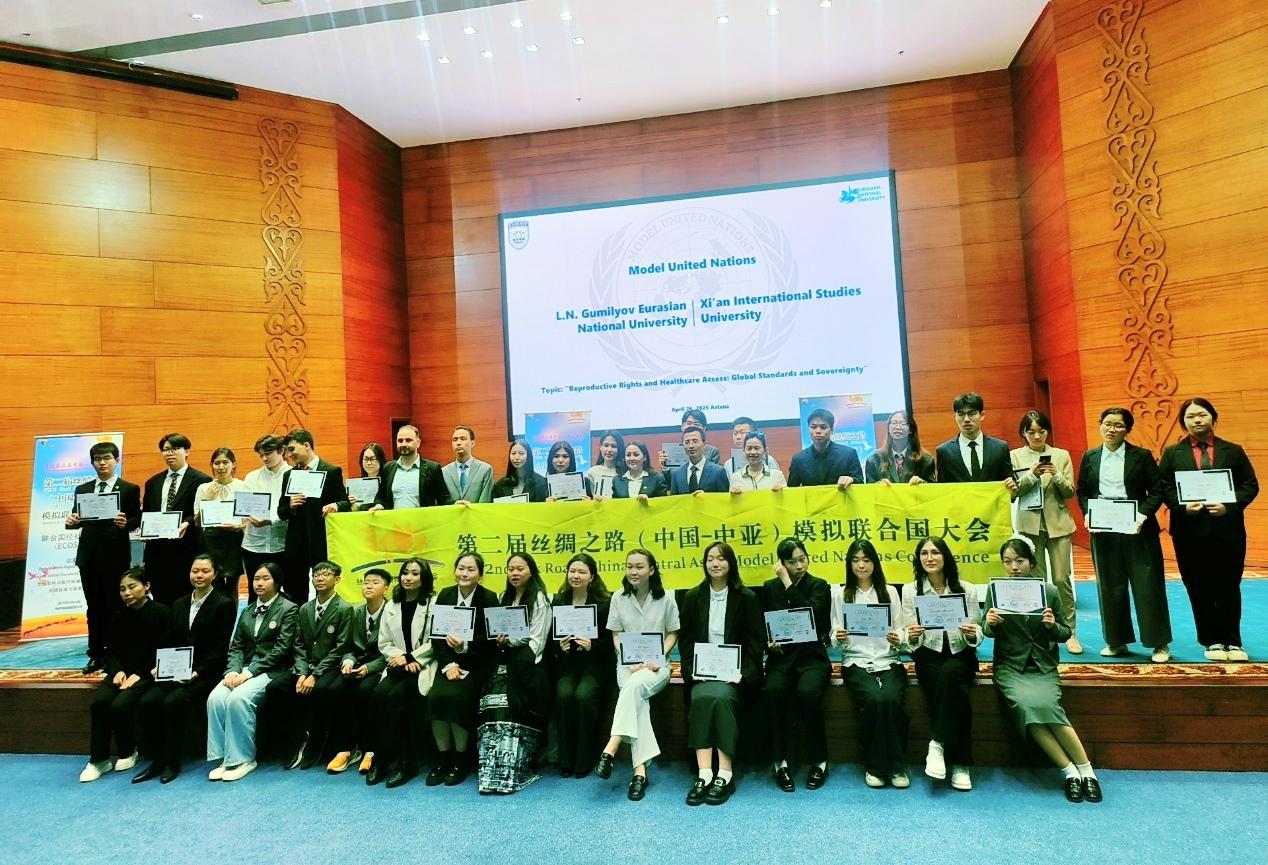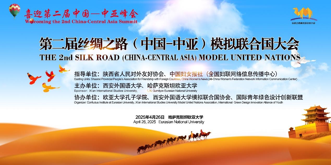 4月26日,第二届丝绸之路(中国-中亚)模拟联合国大会阿斯塔纳峰会在哈萨克斯坦国立欧亚大学隆重举行。本次大会由中国妇女报社(全国妇联网络信息传播中心)、陕西省人民对外友好协会指导,西安外国语大学、哈萨克斯坦国立欧亚大学主办,欧亚大学孔子学院、西安外国语大学模拟联合国协会、国际青年绿色设计创新联盟承办。西安外国语大学校长吴耀武(线上)、哈萨克斯坦国立欧亚大学国际关系学院院长古丽西姆·朱马巴耶夫娜等领导受邀出席开幕式并致辞,双方共计60余名师生代表全程参与本次大会。
