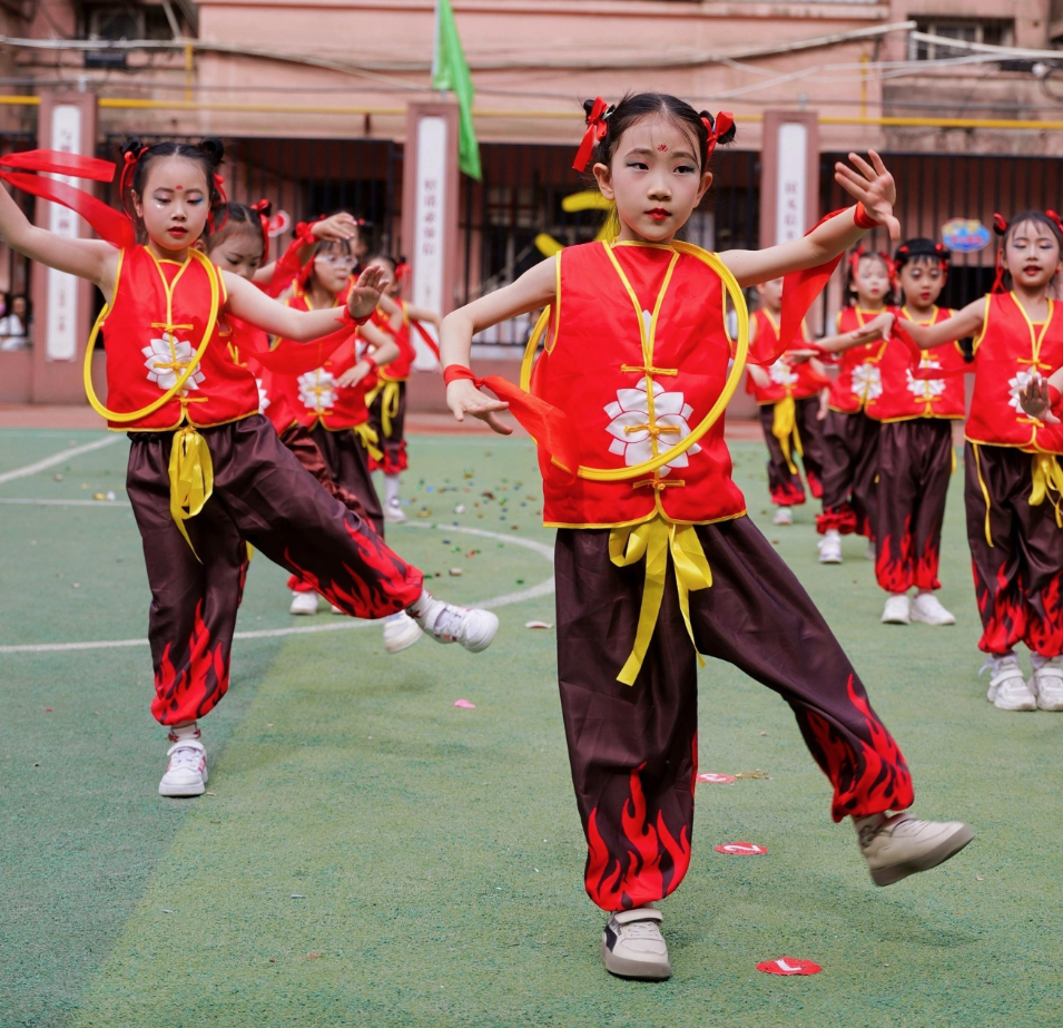 开幕式上,精神饱满的同学们精彩展现了日常课间活动的真实场景和体育锻炼的常态化成果:哪吒方队中,一二年级的孩子们身着红绫金甲,以灵动舞姿再现哪吒的英勇无畏。表现了“乐小”学子的蓬勃朝气与文化自信;由140位“乐小”学子组成的功夫扇方队,手持红扇,刚柔并济,以飒爽舞姿演绎家国情怀;少年们手中的绸扇如出鞘银刃,色彩明艳的扇子在手中翻飞,三(2)方阵以灵动舞姿为赛场注入热情;足球方阵中,小运动员们以整齐的队形展示运球、传球等基本功,配合动感音乐完成精彩的花式足球表演;最美大课间的二(1)班方阵,用最纯粹的热情诠释了运动精神——不论输赢,只为绽放;篮球方阵中,小球员们活力四射的表演既展现篮球基本功,又彰显团队协作魅力;热情奔放的恰恰、惊艳的伦巴舞步,拉丁舞方阵将舞蹈的活力与自信展现得淋漓尽致;二(3)方阵中,孩子们手持七彩小伞,像一群快乐的小精灵随着欢快的音乐旋转,展现出力与美的碰撞;健美操方阵表演中,小健儿们身着统一服装,配合轻快的音乐,传递出健康快乐的童年气息;队形变换如行云流水,童真表演尽显文化余韵,中国舞方阵让文化传承展现出动人的风采。