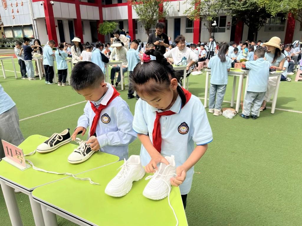 低年级组比赛主要体现为自理能力。瞧,一条条鲜艳的红领巾在他们的巧手下,瞬间变得服帖而整齐;看,小小的手指灵活地穿梭在蒜瓣之间,不一会儿,一个个白白胖胖的蒜瓣就整齐地摆放在盘子里啦;在穿、系鞋带比赛中,一根小小的鞋带,在同学们的手中变得灵活多变。他们手法娴熟地打结、拉紧,最后完成一个漂亮的蝴蝶结;整理书包过程中,小选手们仿佛化身为小小整理师,一双双小手灵活地穿梭在书本与文具之间,将书包变成了一个个井然有序的小世界。