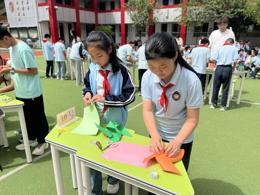 中年级组比赛中,主要有削土豆、叠衣服、穿手链,在制作七巧板比赛中,参赛选手们手握彩纸与剪刀,眼神专注地沿着线条裁剪,折叠、画线、剪裁一气呵成,三角形、正方形、平行四边形在指尖成型。这方寸间的剪裁拼贴,不仅是手眼协调的锻炼,更让几何智慧与劳动乐趣在实践中碰撞,为思维插上创造的翅膀。