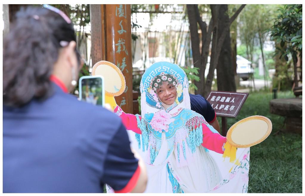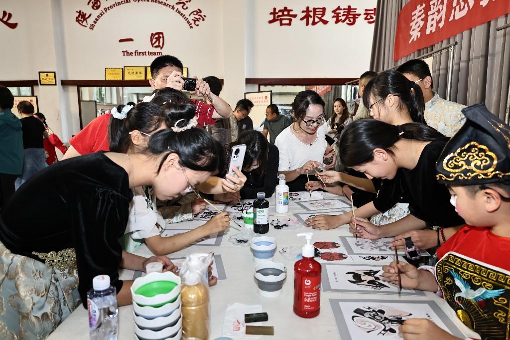 活动开场前,陕西省戏曲研究院匠心打造的十大特色文化体验区率先点燃现场气氛。戏曲人物打卡点古韵十足,戏曲服装试穿区霓裳翩翩,戏曲化妆体验区妙笔生花……深港交流团成员们纷纷沉浸其中,身着华美戏服定格精彩瞬间,体验传统戏曲妆容的独特魅力,欢声笑语回荡在整个场馆,文化交融的热情在此刻尽情释放。