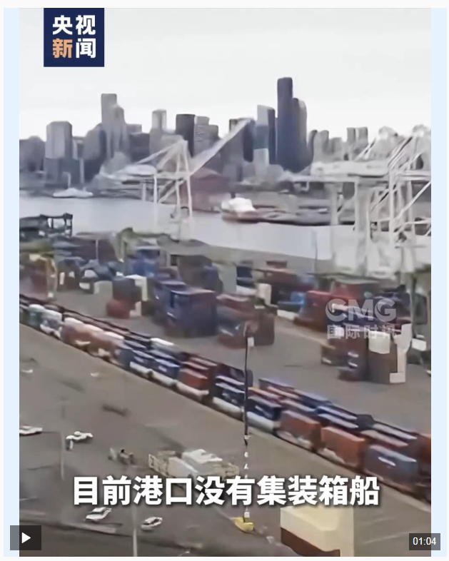 美国西雅图港港务局长瑞安·卡尔金斯5月7日在接受美国有线电视新闻网采访时表示,受到关税政策的影响,目前西雅图港没有一艘停靠的集装箱船。码头上没有工人卸载货物,也没有火车把货物运往内陆港口,这是非常不寻常的情况。