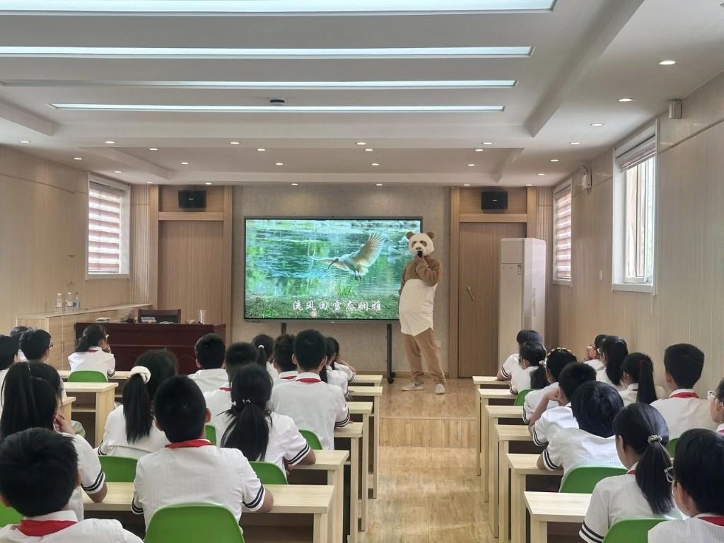 动物科普环节则以活泼的情景剧形式展开。秦岭大熊猫研究中心的闵嘉隆老师化身“七仔”,模仿大熊猫的动作,生动演绎了大熊猫的生活习性,逗得同学们笑声不断,同时巧妙地将保护知识融入其中。此外,朱鹮作为曾经濒临灭绝的珍稀动物,其故事尤其引人入胜。朱鹮的一夫一妻制习性令同学们惊叹不已,它们对配偶的忠诚和共同守护家园的行为,展现了动物世界中也有着深深的情感纽带。闵老师通过讲述朱鹮濒危历程,强调了保护濒危物种的紧迫性和重要性,以及人类在其中所肩负的责任。