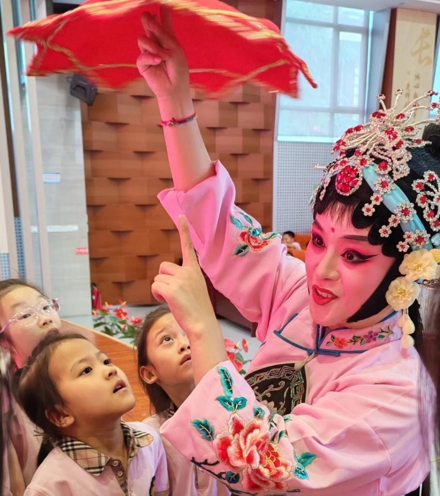精彩的戏曲表演环节令人难忘。《拾玉镯》片段中,演员细腻演绎孙玉娇的娇羞、活泼与喜悦,精致妆容、华丽服饰以及举手投足间的韵味,让孩子们沉浸其中,不时惊叹鼓掌。《荒郊义救》更是将活动推向高潮,演员们激昂唱腔、精彩对白和流畅动作,生动展现剧情跌宕与人物忠肝义胆,孩子们被精湛技艺深深折服。水袖技巧和手帕技巧展示环节,水袖轻舞飘逸,动作恰到好处,尽显韵律美;手帕在演员手中似有生命,旋转翻飞,花样奇妙,引得孩子们目不暇接。