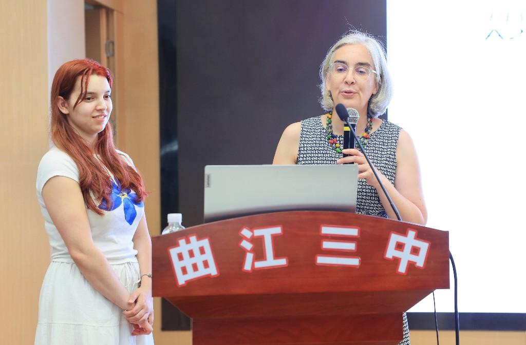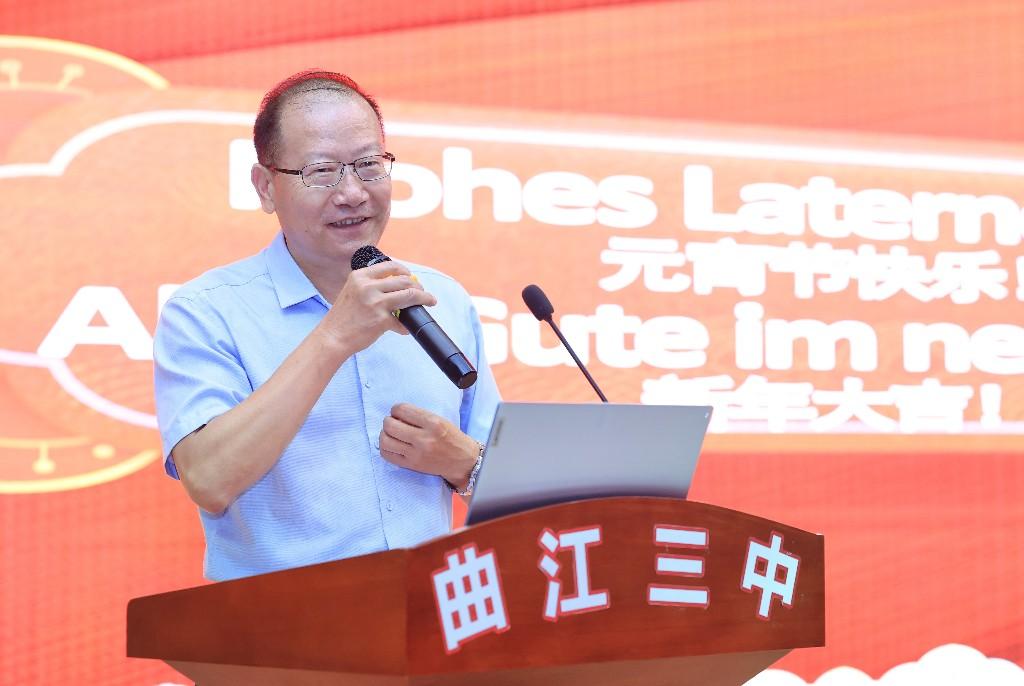 三秦都市报-三秦网讯(记者 陈飞波)为深化德语特色教育,进一步落实“因材施教 开放包容”的办学理念,助力学生拓展国际视野。5月19日,西安市曲江第三中学举办了德语交流活动,活动特邀西安歌德语言中心负责人Carola Krüger,德语教学顾问Khadija参加活动,与学生进行主题互动交流。西安市曲江第三中学党支部书记、校长崔平,学校教学专家黄纯等出席活动,西安市曲江第三中学德语教师王文静主持活动。