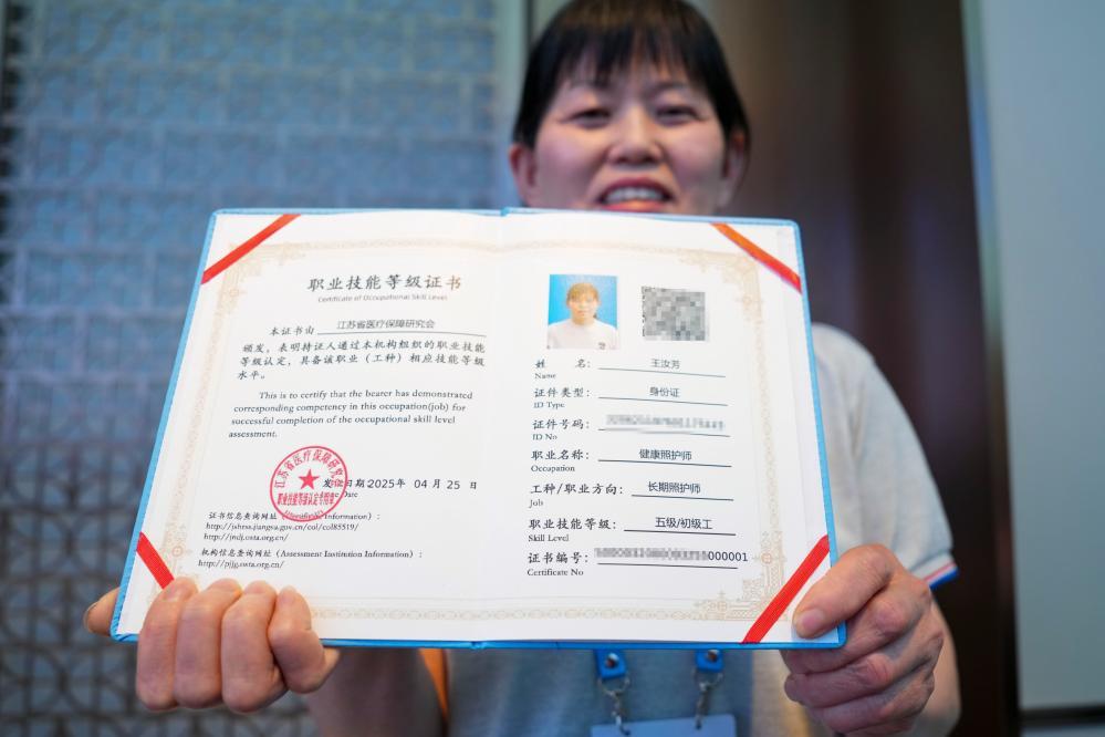 从洗发、穿脱衣物等生活照护,到测量血压、血糖等基础护理,再到识别噎食、误吸等应急处置……王汝芳通过了系统的学习培训,现在,也和陆亚云一样,“持证上岗”。
