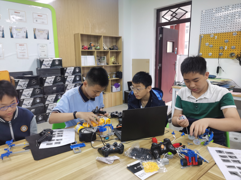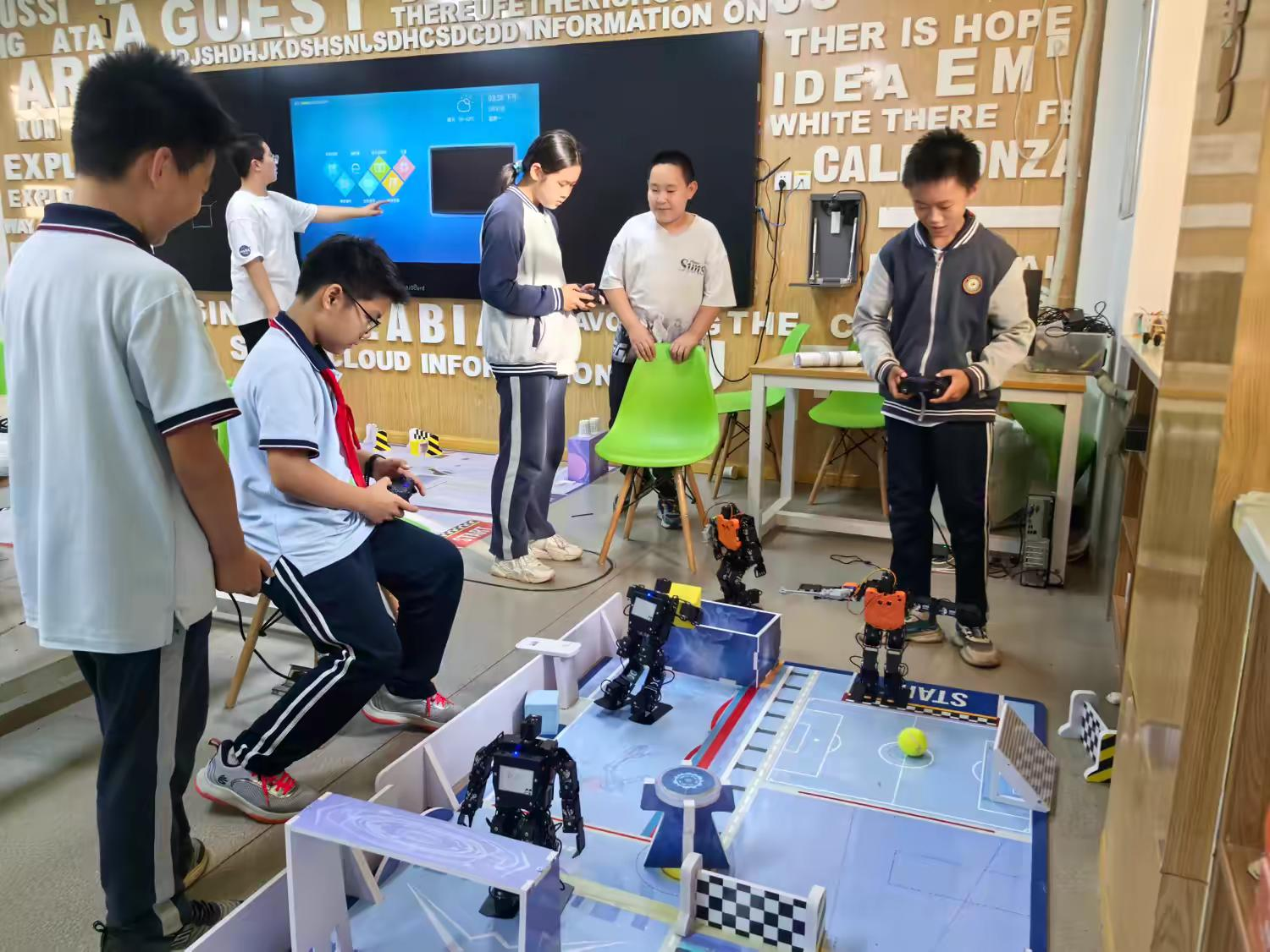 2018年学校推行“创新”教育,新建创客实践室,开设“星光创客空间”社团,以创客社团为平台,“以赛带教”“以赛促学”开设了图形化编程、北斗创意搭建、水中机器人协同竞技、魔幻光影、3Done等特色课程,让创客社团成为学校的特色社团;2019年,学校全面推行创新教育,增加创客实践室建设资金,将创客实践室与人工智能实验室融合,完善课程体系,率先在七年级开设了人工智能入门课程、在四五年级开设图形化编程课程,在常规教学中渗透科技教育。由此建立了面向全体学生的普及型人工智能课程、面向社团的提高型课程、面向赛事的比赛型课程的三级梯队型课程体系。