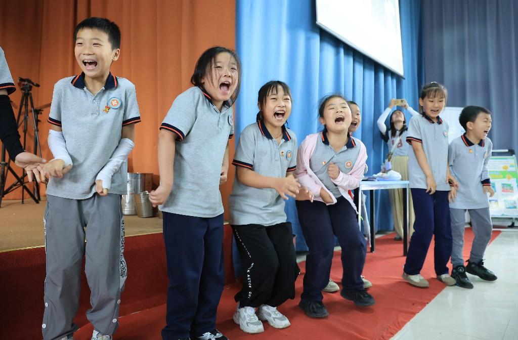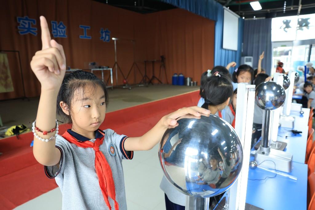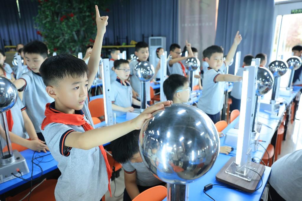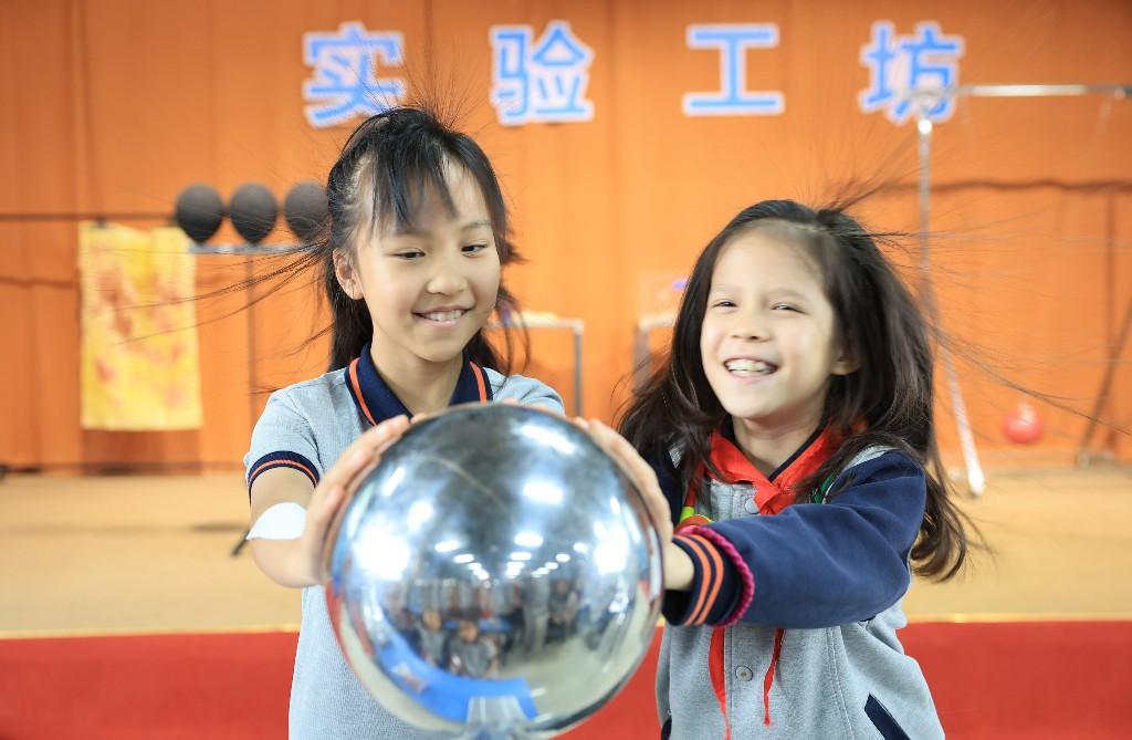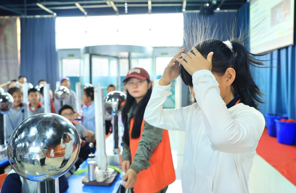 孩子们围在静电发生装置前,亲眼见证了一场“静电魔法秀”——随着老师缓缓旋动电压调节旋钮,彩色皱纹纸花突然挣脱引力束缚,在孩子们的头发上划出绚丽的螺旋轨迹,引起场下学生阵阵欢呼。