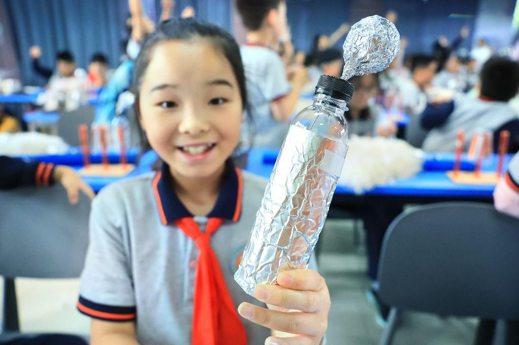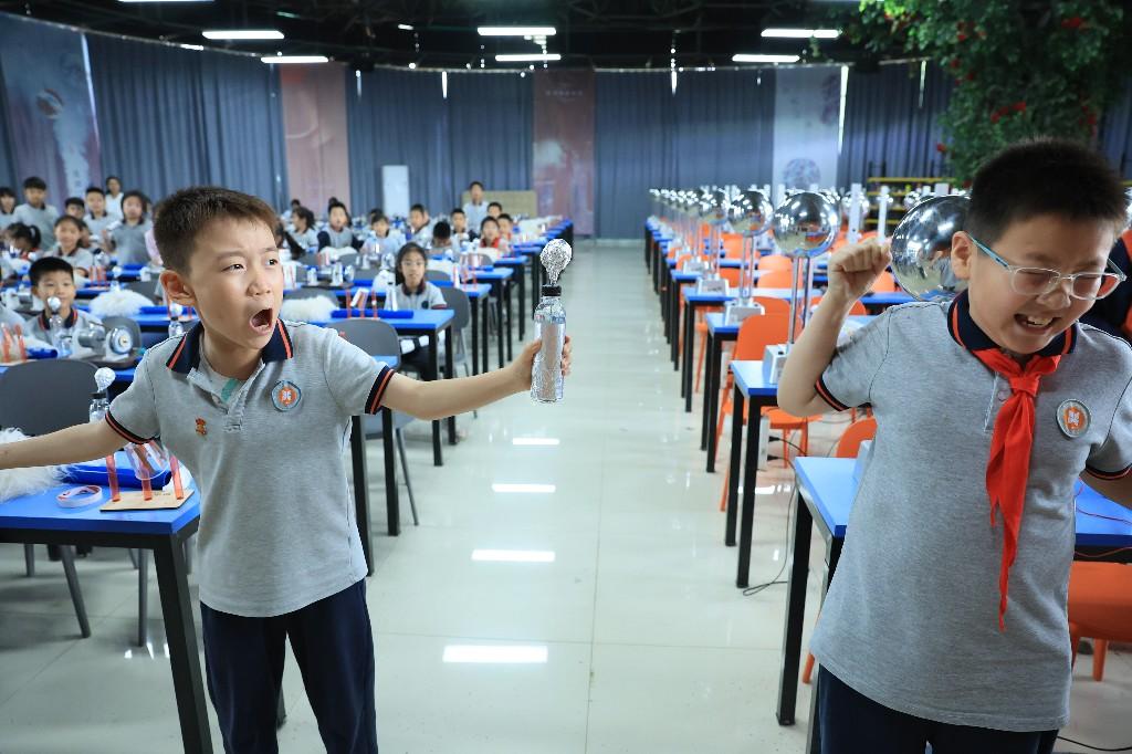 在“莱顿瓶手作”环节,学生们化身小小发明家,亲手复刻人类历史上首个蓄电池。当自制的莱顿瓶成功放电,以班级为单位,学生们手拉手围成一个圈同时感受微电流的震颤时,现场爆发出阵阵尖叫。“三秦学生记者”张盟越告诉记者:“当触电的那一瞬间,感觉自己的手像被拉了一下,是一次很奇妙的体验。”这种跨越时空的科技对话,让抽象的电学知识变得真实可感。