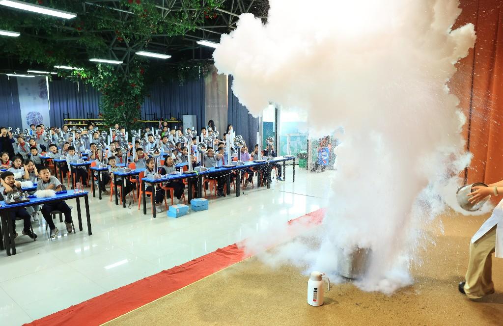 实验台上,在超低温的液氮与沸腾纯水接触瞬间,反应界面爆发出密集气化现象,银白色雾柱伴随着剧烈相变产生的冲击波,在实验舱内骤然升腾成冷凝云团。实验工坊中,学生们亲手操作电路实验、声波装置,通过触觉、听觉和视觉的多维体验,深入理解电与声的物理原理。