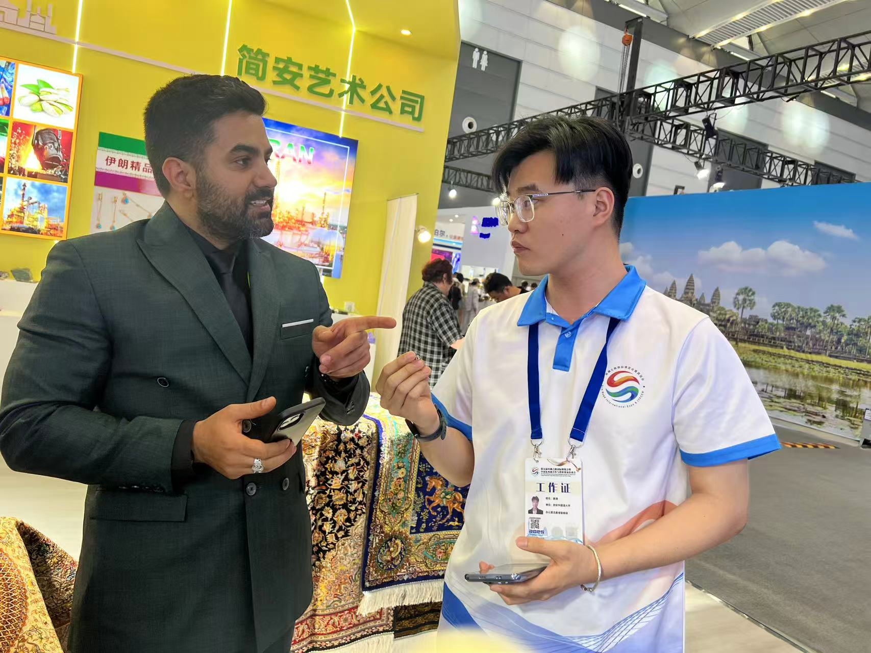 西安外国语大学英文学院研究生薛涛就是其中一员。今年,他被分配至伊朗展馆,为来自伊朗的Vahid Babaee一家三口提供翻译支持。该展位主要展示和销售伊朗绿松石、玛瑙与传统地毯。展会第一天,得知要服务伊朗展商,薛涛一度感到既兴奋又紧张:“语言是一方面,文化理解也是关键。怕自己知识储备不够,影响交流。”于是,他第一时间开始查阅伊朗国情、玉石工艺及绿松石相关的行业术语。