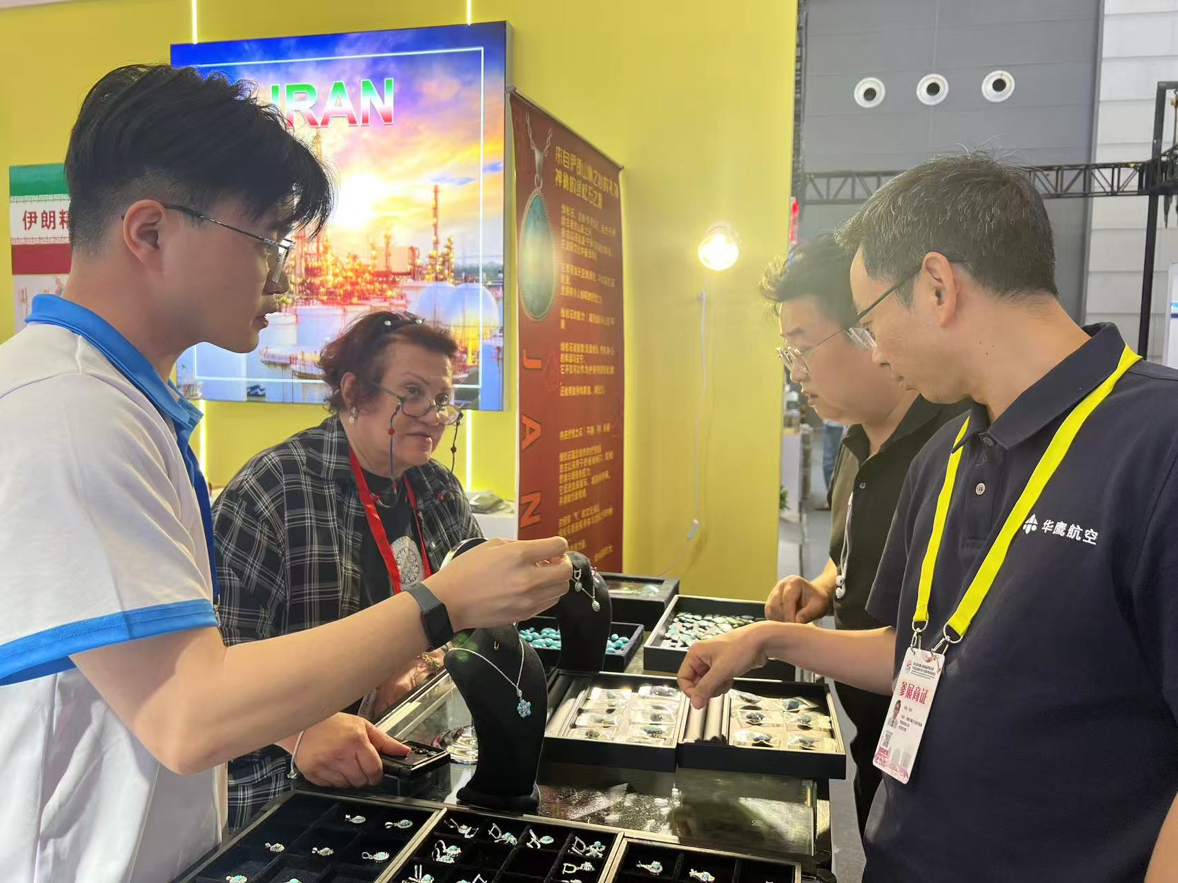 展馆现场,伊朗展商Reza正在布展,原石绿松石在灯光下泛着幽幽蓝光,但对初次接触玉石饰品的薛涛来说却颇为陌生。他没有退缩,而是利用空闲时间钻研绿松石的成因、品质判断标准和市场行情。“我们不是展品的专家,但要成为沟通的桥梁,就必须先成为学习者。”他说。