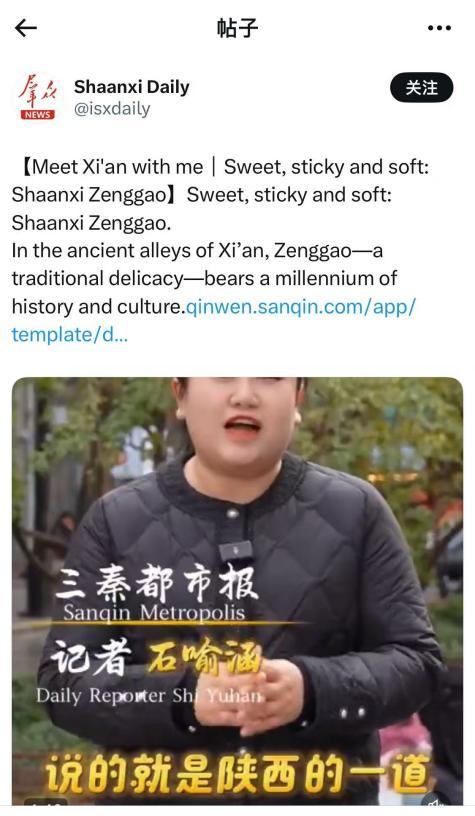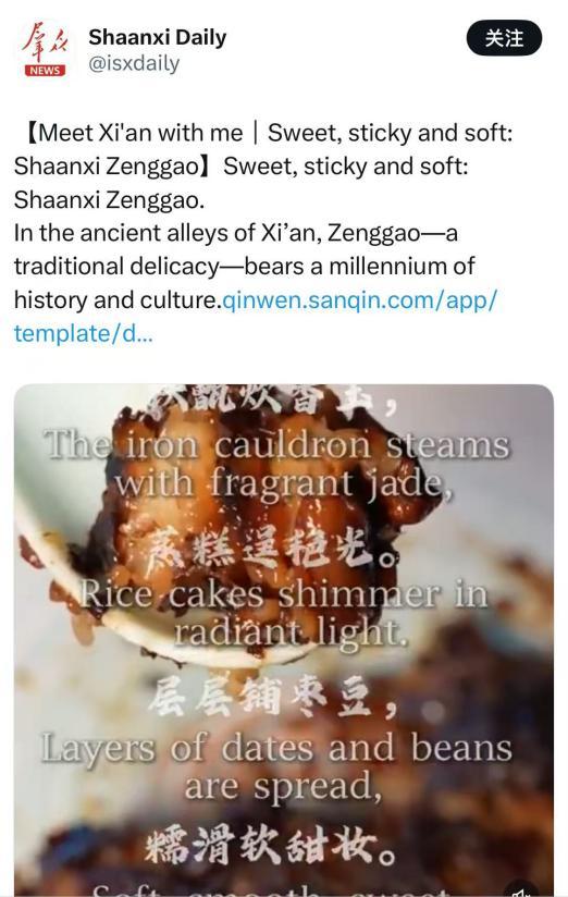 三秦都市报、三秦网短视频团队挖掘陕西美食甑糕等历史渊源、制作工艺和文化寓意,12月13日制作发布了《喻见西安|甜黏软糯 陕西甑糕 Meet Xi'an with me|Sweet, sticky and soft: Shaanxi Zenggao》国际传播作品,不仅展示了中华美食文化的魅力,也让海外受众更深入了解了中国的饮食文化和传统技艺,为中国美食文化的国际传播提供了新的视角和途径。