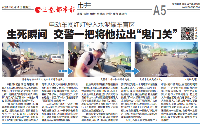 6月14日刊发的《电动车闯红灯驶入水泥罐车盲区 生死瞬间 交警一把将他拉出“鬼门关”》,不仅配以现场视频二维码,更以一组三张现场视频截图,生动还原了生死时刻交警救出骑车市民的现场画面,极具冲击力和传播性。