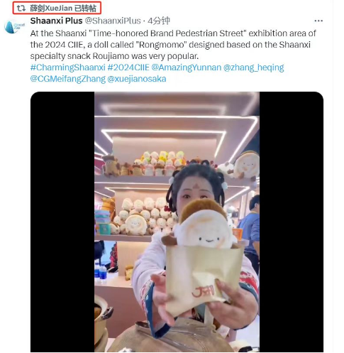 在第七届进博会上,本报独家视频《走 进博会陕西馆吃肉夹馍去 Come to the Shaanxi Pavilion at the CIIE to enjoy a delicious Roujiamo!》被上海时刻、陕西都市快报、金融时报、浦东发布、贝壳财经等多家媒体跟进报道。次日该视频产品被推送至X平台(原推特平台)“shaanxi plus”账号,被中国驻日本大阪总领事点赞并转发。