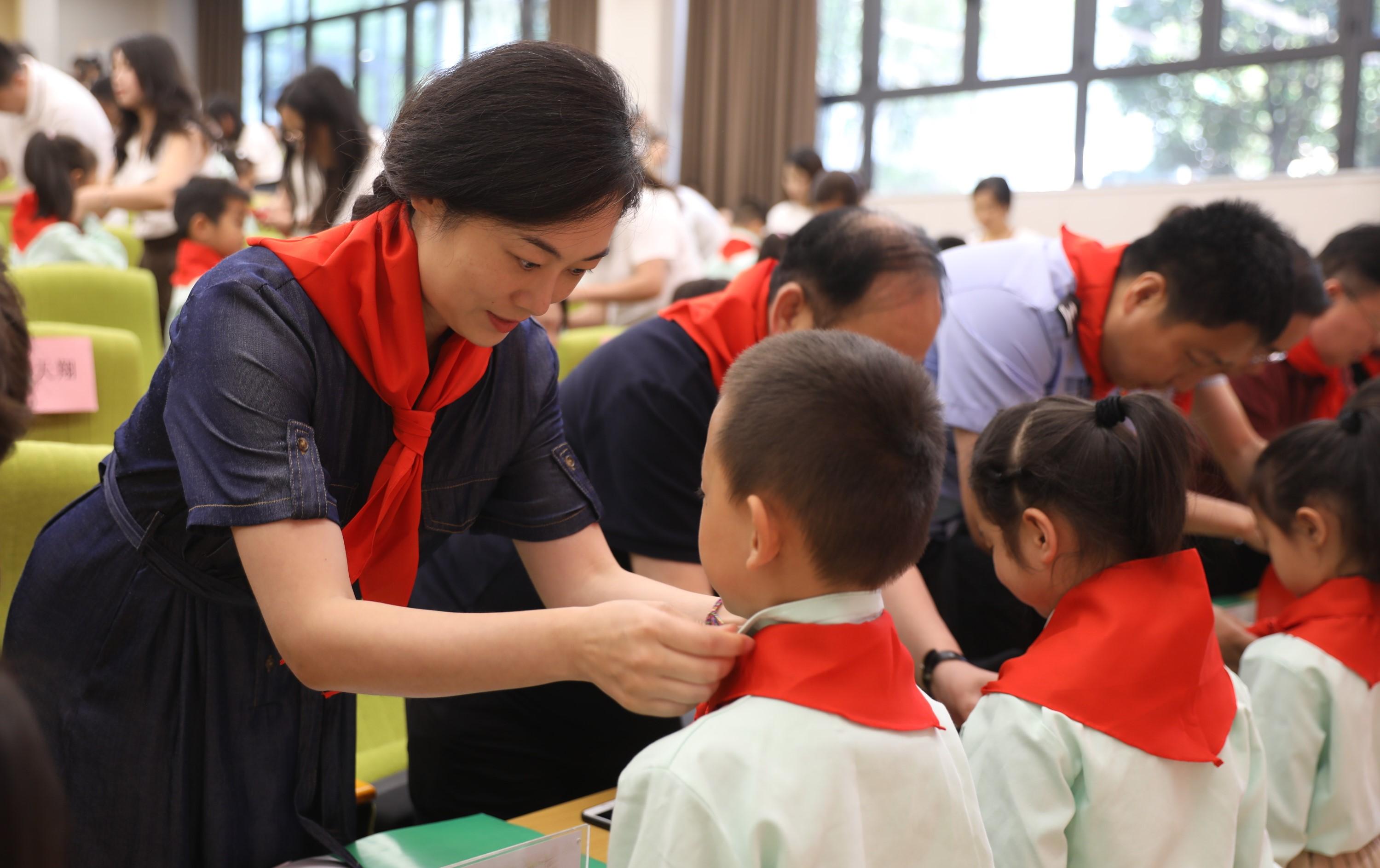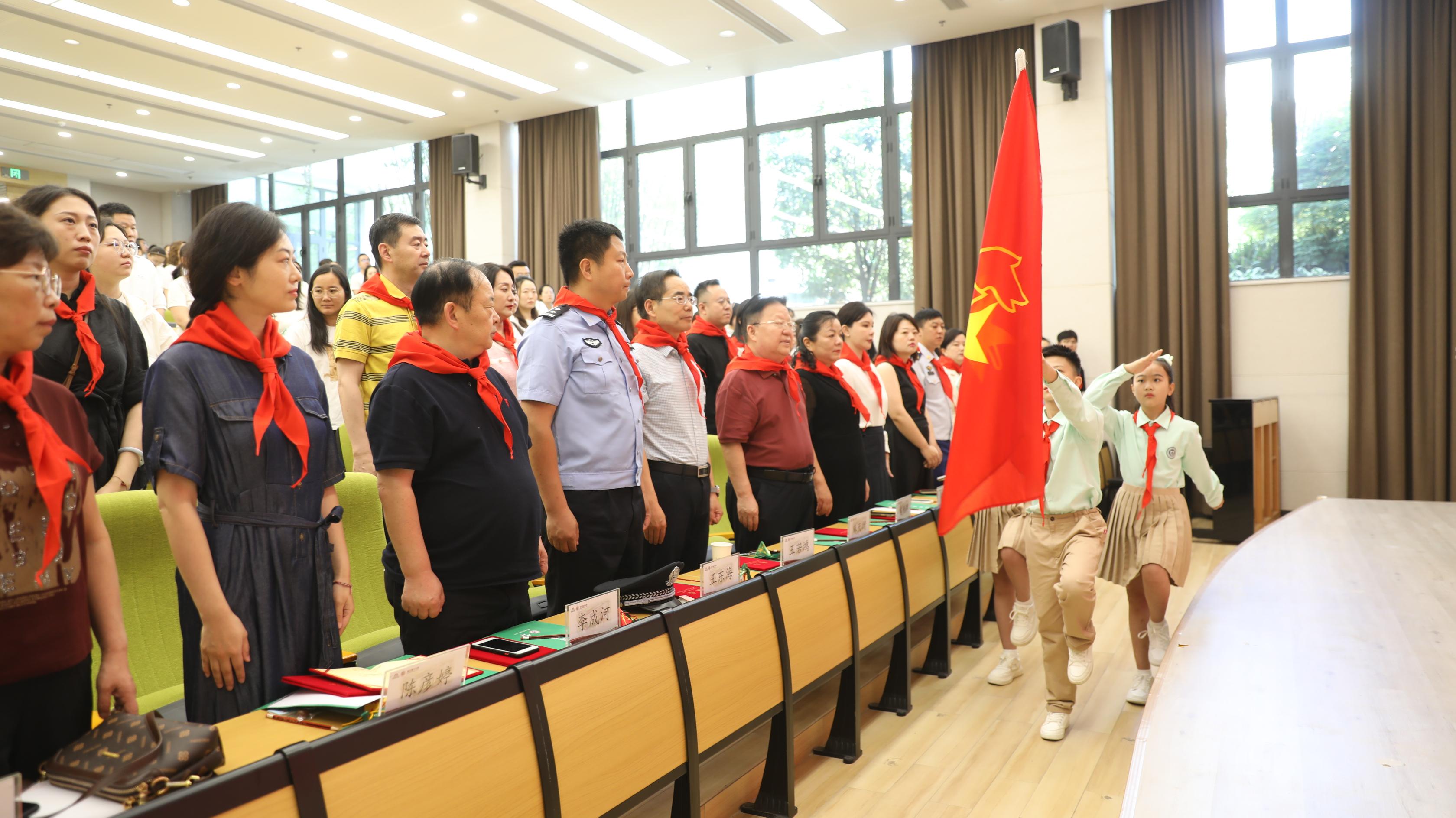 入队仪式在庄严的队旗下拉开序幕。大队辅导员职东培老师宣读组建一年级少先队组织的决定及新队员名单。伴随着激昂的旋律,校外辅导员代表和满怀期待的家长们走上台前,郑重地为新队员佩戴上鲜艳的红领巾。这一刻,象征着责任与荣誉的传递。学校现场聘任了新一届中队辅导员,并颁发聘书、授予中队旗,标志着少先队组织的壮大与党团队相衔接育人链条的巩固。