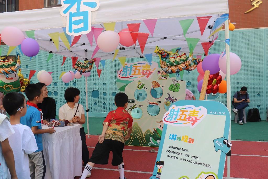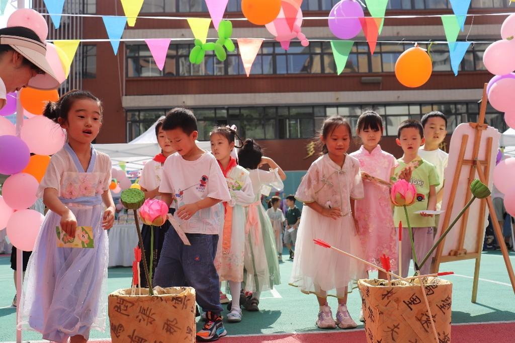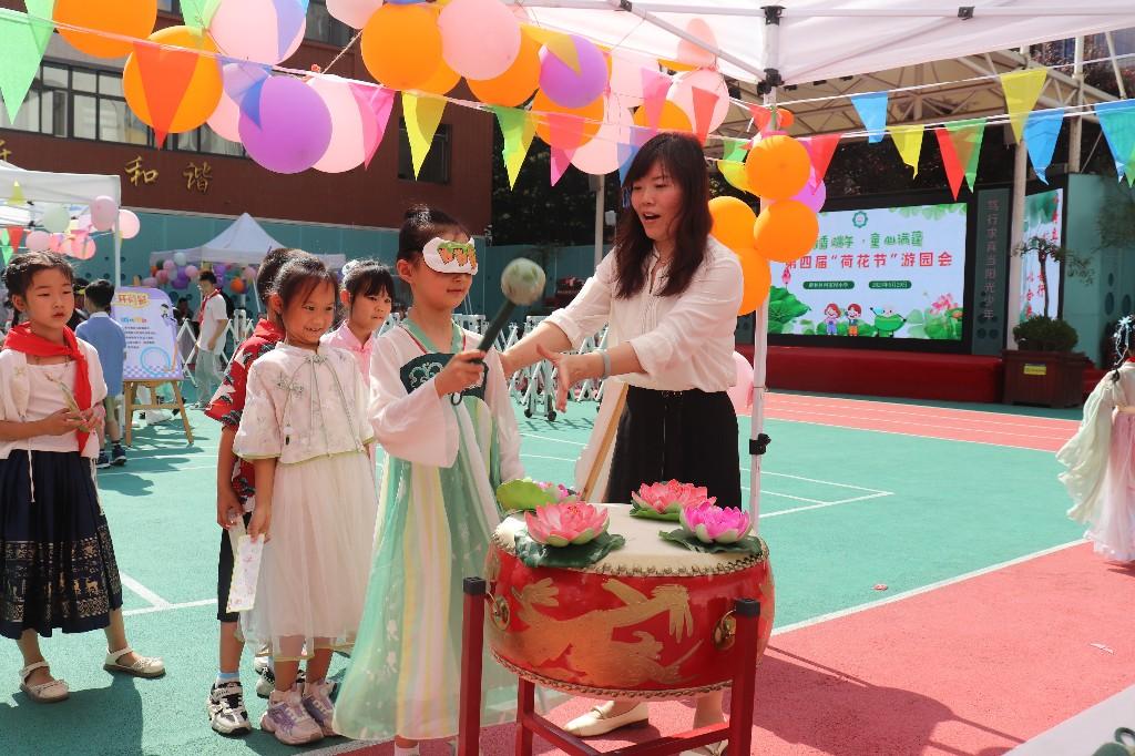 游园会现场,13个精心设计的“荷”主题关卡成为孩子们探索与学习的乐园。“解荷锁”考验耐心巧思,“射五毒”传承古老民俗,“蒙眼击鼓”激发无限潜能……每个通关印章都暗藏玄机。当孩子们最终集齐“何小学子戏荷丛,童心莲子笑满蓬”的完整诗句时,传统文化的种子已在心田悄然播撒。