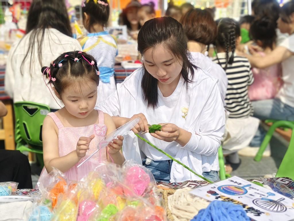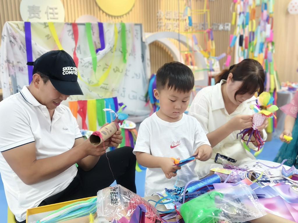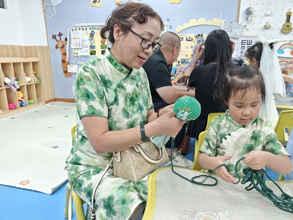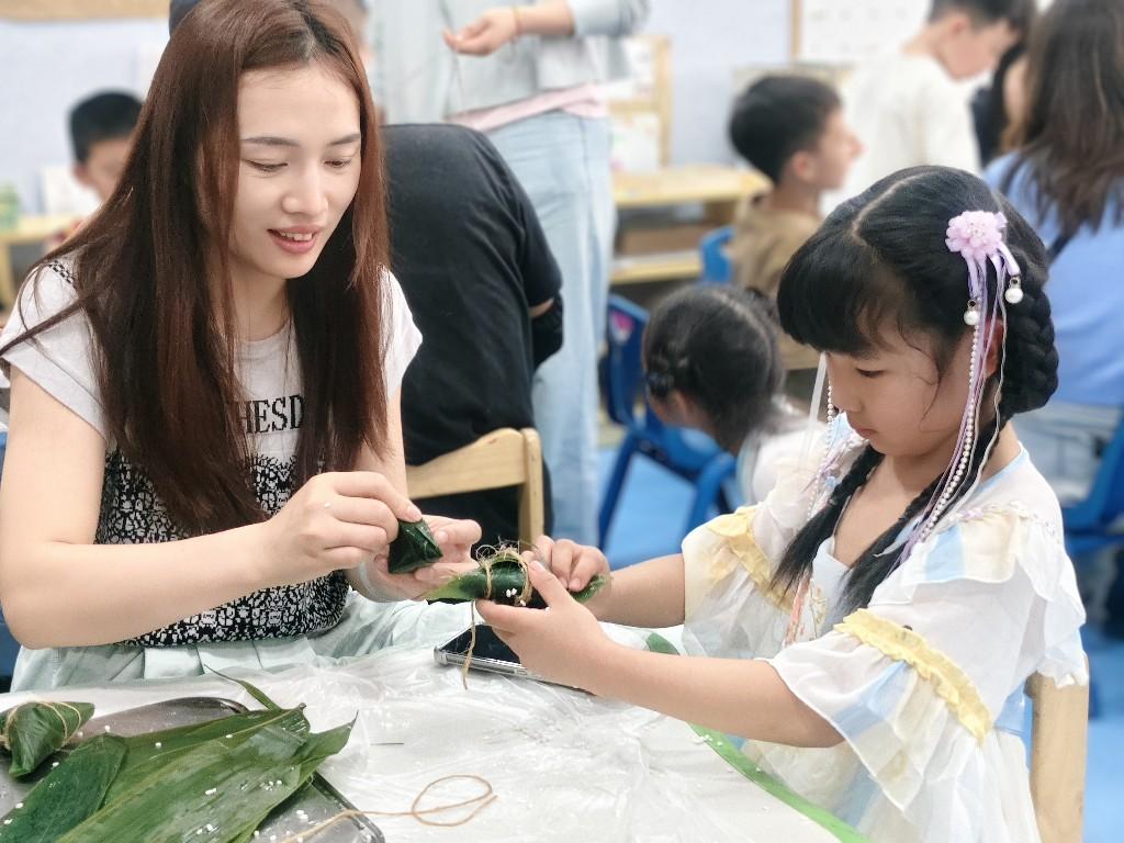 亲子互动环节中,家长与孩子共同参与编织、包粽子等传统活动,在协作中体验端午文化。