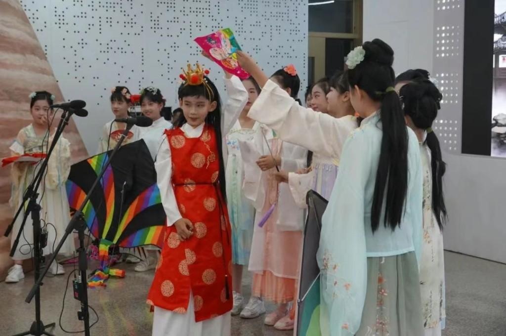 在科技与古典碰撞的“红楼妙趣斋”,人工智能设备将静态插画幻化成动态场景:大观园花瓣纷飞中,林黛玉的衣袂随学生手势翩然舞动。相隔数米的公益捐书区,端午五彩丝绳与名著人物彩绘在孩童腕间交织,恰似《楚辞》香草遇见西游神话。