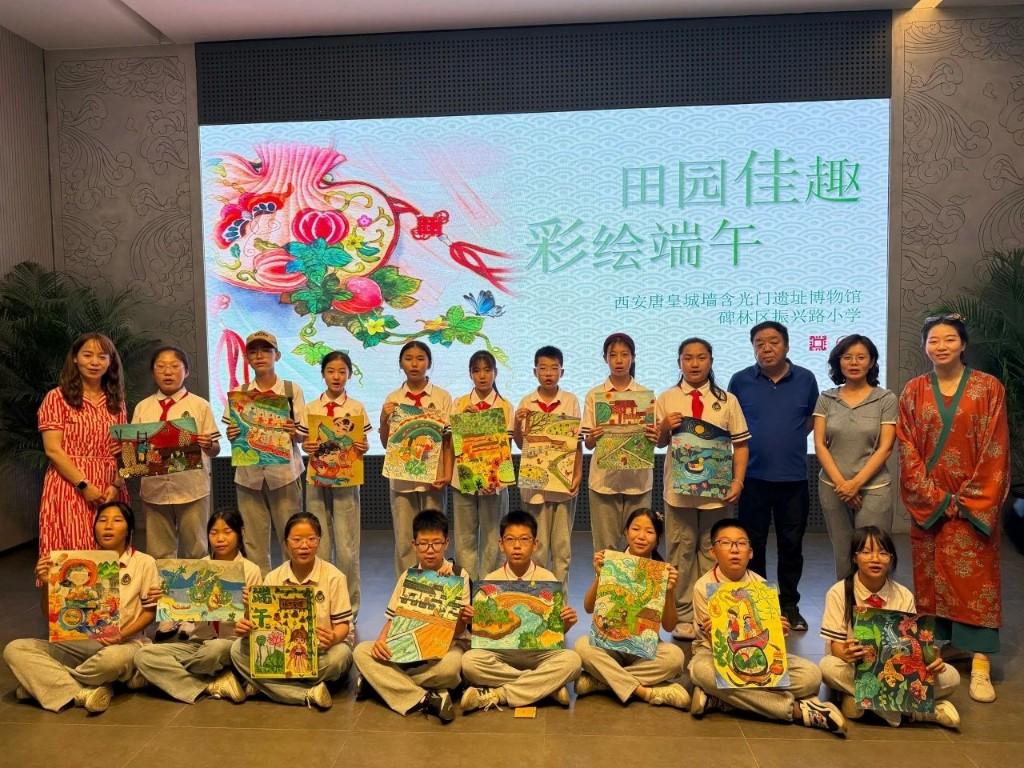 三秦都市报-三秦网讯(记者 吕云涛)5月30日下午,西安市碑林区振兴路小学学生代表走进西安唐皇城墙含光门遗址博物馆,开启“田园佳趣 彩绘端午”主题实践活动。从触摸千年城墙的历史肌理,到沉浸于农民画的民俗世界,再到挥动画笔创作属于自己的艺术作品,这场跨越时空的文化之旅,让课堂“活”了起来,也让传统文化在少年的创意中焕发新生。