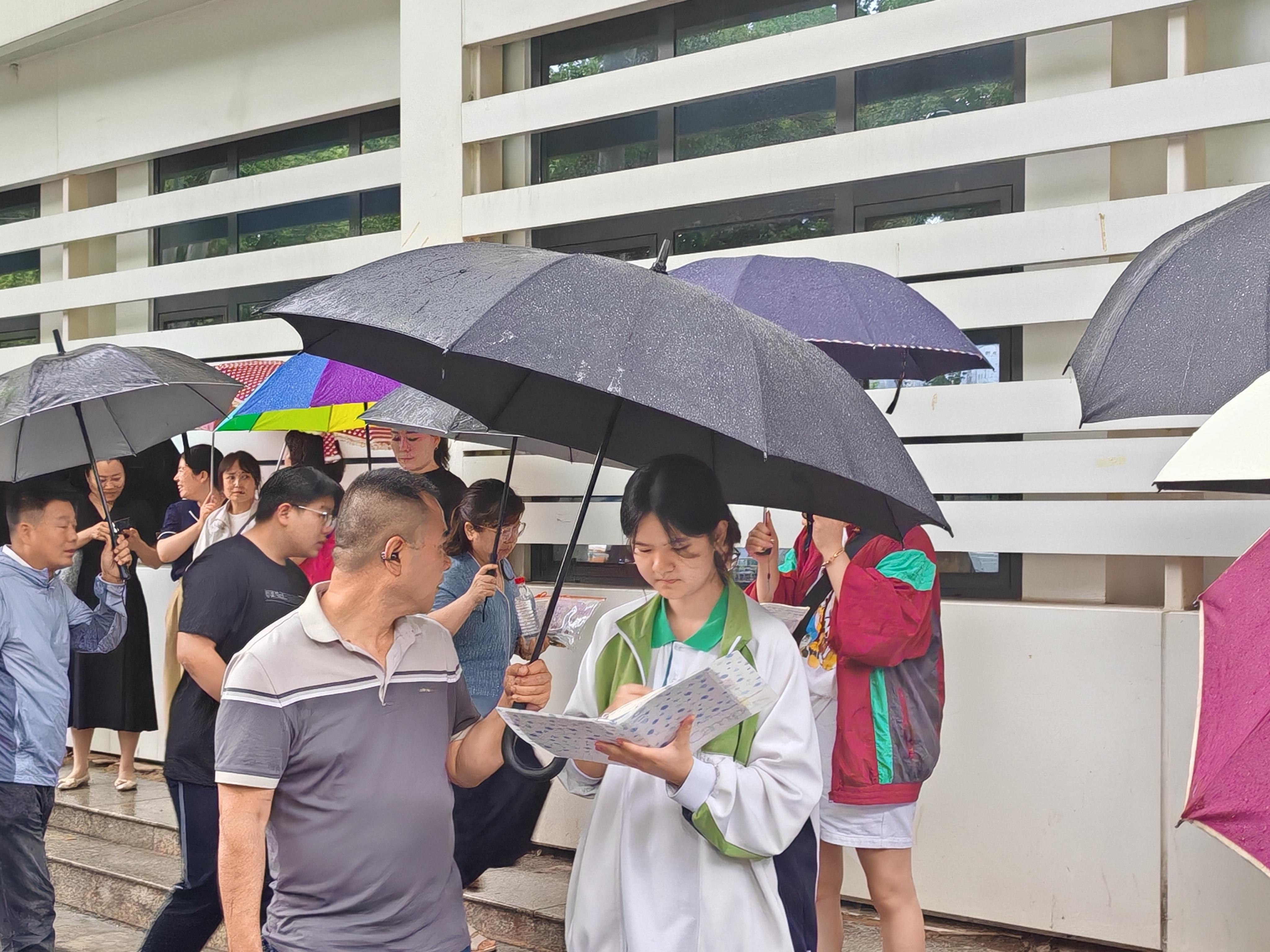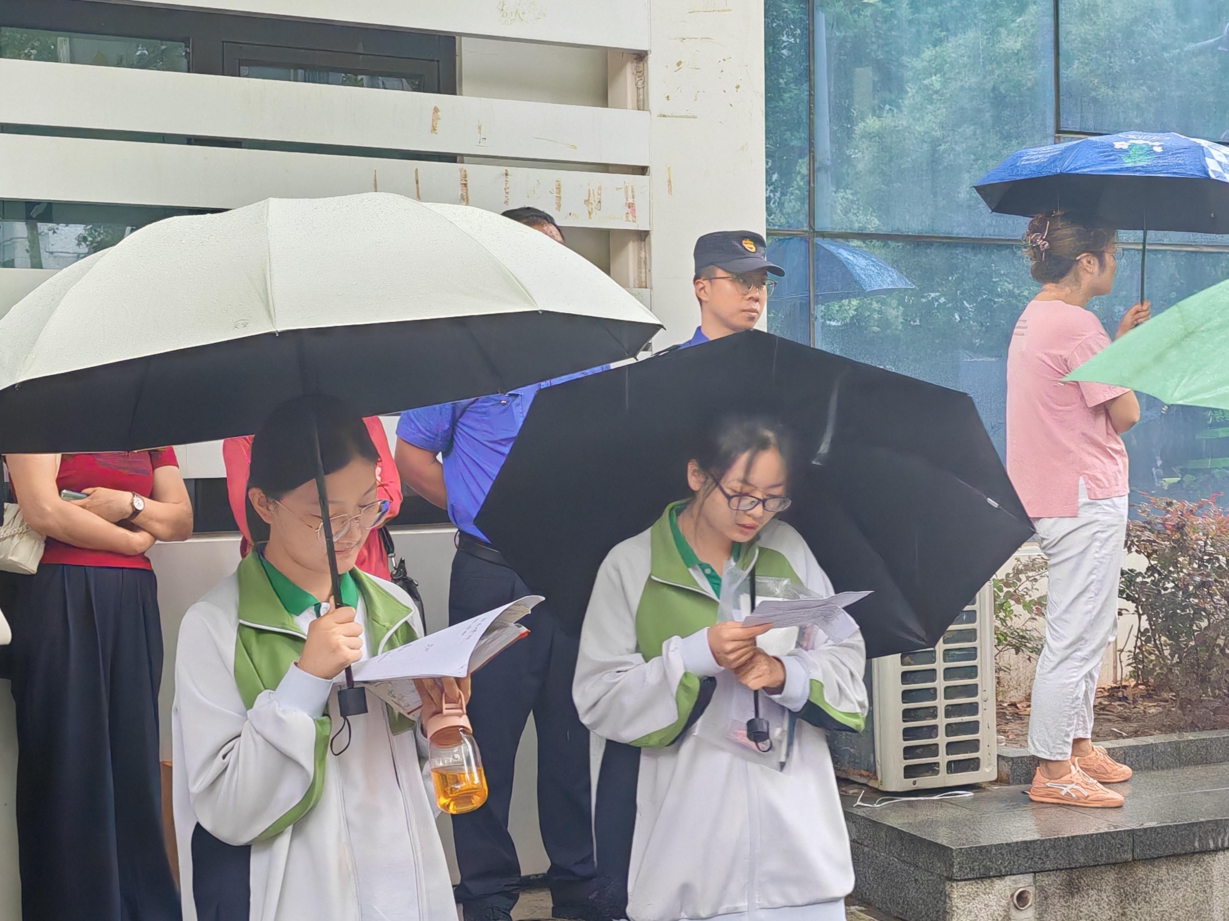 有的同学拿着准考证步伐坚定走向考场,有的同学则在伞下抓紧最后的时间复习。