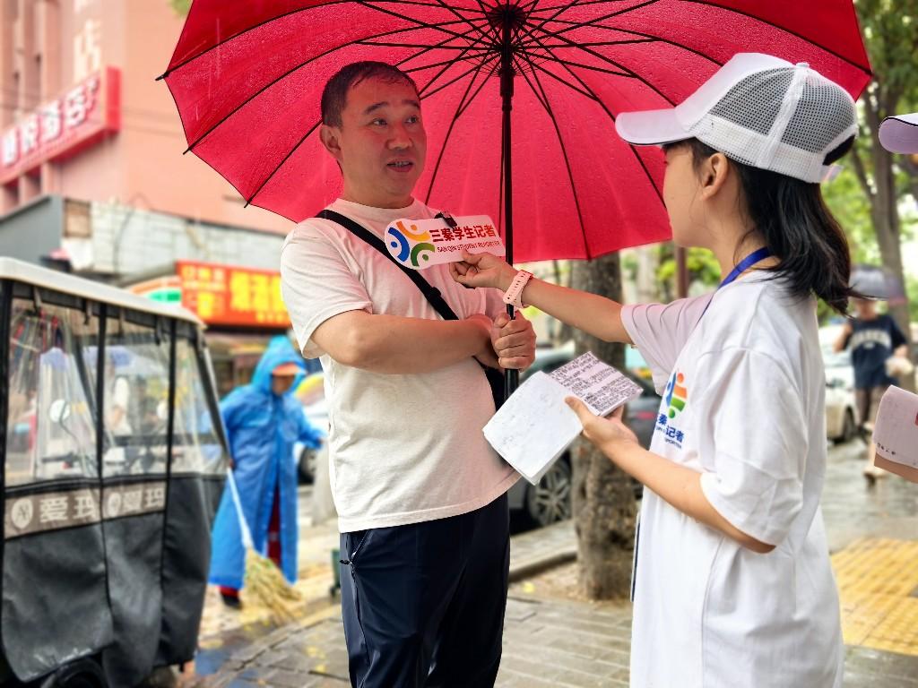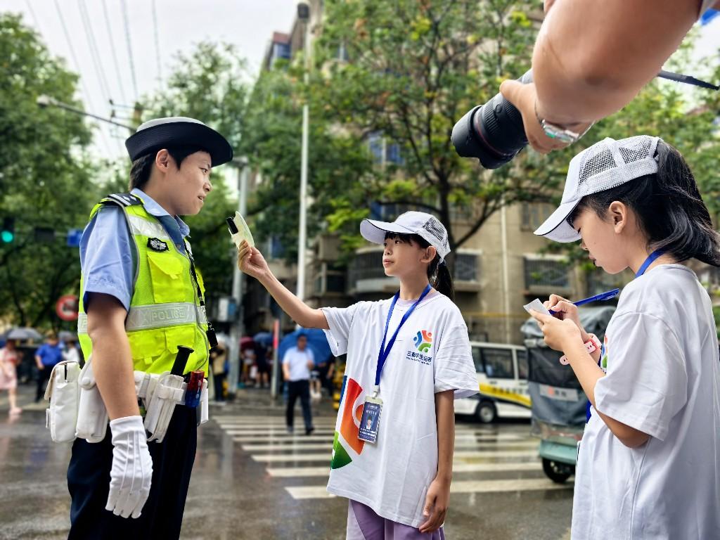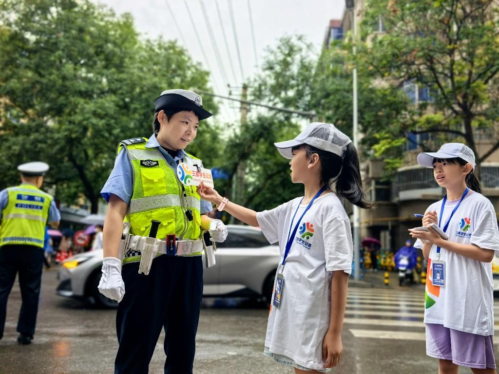 张煜薇和杨依晨两位学生记者则采访了西安市公安局交通管理支队碑林大队的韩雪警官。韩雪警官身着整齐的警服,英姿飒爽地站在雨中,指挥着交通。