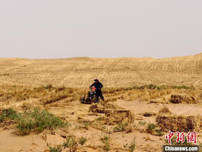 图为治沙人付俊年熟练地操控着压沙机,稳步前行。徐晓玲 摄