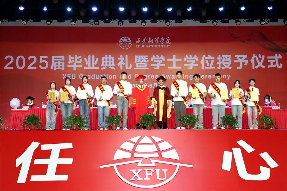 国歌奏响,全场肃立。随着栾宏宣布《关于准予王欣宜等5065名本科生、曹少航等471名高职生毕业的决定》和《关于授予2025届本科毕业生学士学位的决定》,标志着毕业生们正式完成学业,迈向人生新的阶段。学位评定委员会全体委员为学位获得者一一授学位、拨流苏,并与之合影留念,将这一荣耀时刻定格成永恒。西安翻译学院党委副书记、副校长张恒宣布《关于表彰2025届优秀毕业生及优秀毕业生干部的决定》。随后,崔智林、栾宏为上台的优秀毕业生代表颁发荣誉证书。