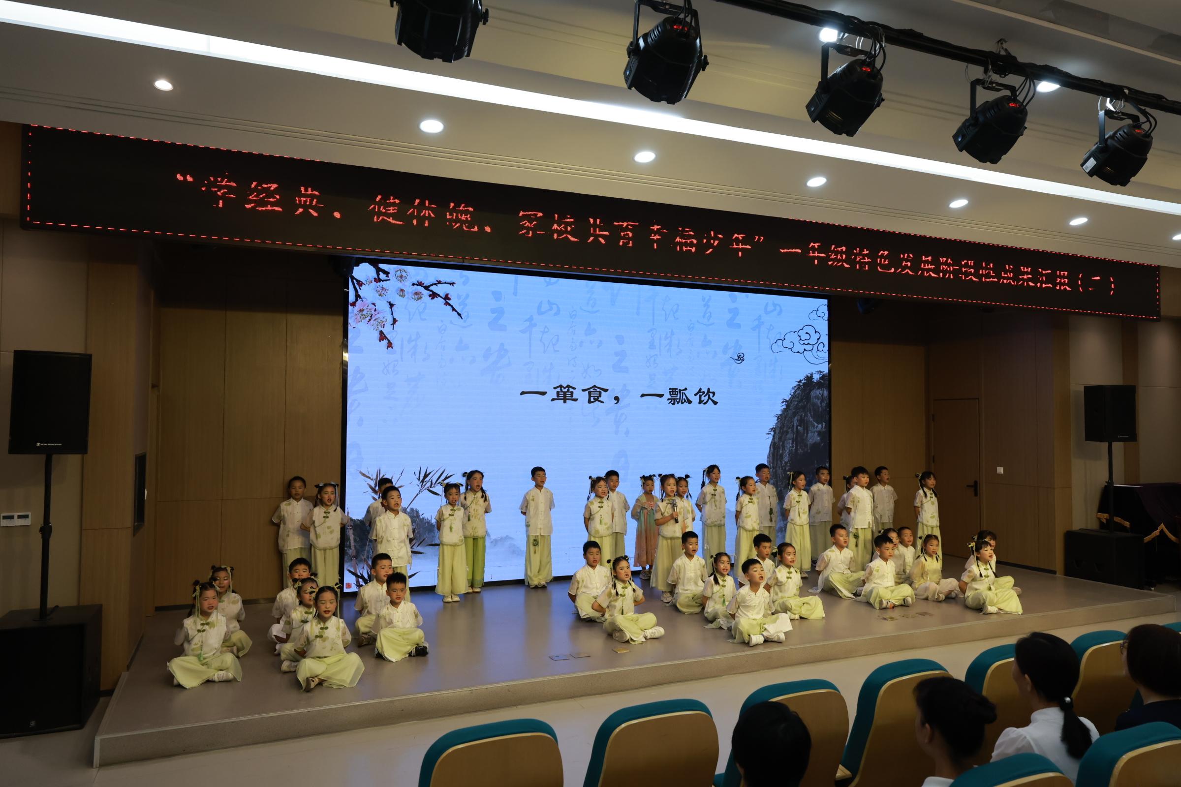 《修身立德》一年级二班:学生们通过诵读《孝弟为人之本》《吾日三省吾身》等名句,探寻千年智慧,感悟修身要义;《勤学笃行》一年级一班:《知之为知之》《学与思》《不耻下问》等篇章的诵读,生动展现了勤学好问的求知礼仪;《言行规范》一年级六班:学生们同声诵读箴言,展现克己复礼的精神,传递言而有信、行笃敬的处事之道;《诚信友善》一年级三班:稚嫩童声诠释《礼之用,和为贵》《人而无信,不知其可也》等句,传递诚信友善之礼;《担当有为》一年级五班:学生们以诵读展现新时代少年的责任意识与担当精神;《家国情怀》一年级四班:深情诵读《事父母几谏》《父母之年,不可不知》《匹夫不可夺志》等篇章,将孝亲敬老、志向坚定、家国天下的情怀深深感染现场观众。
