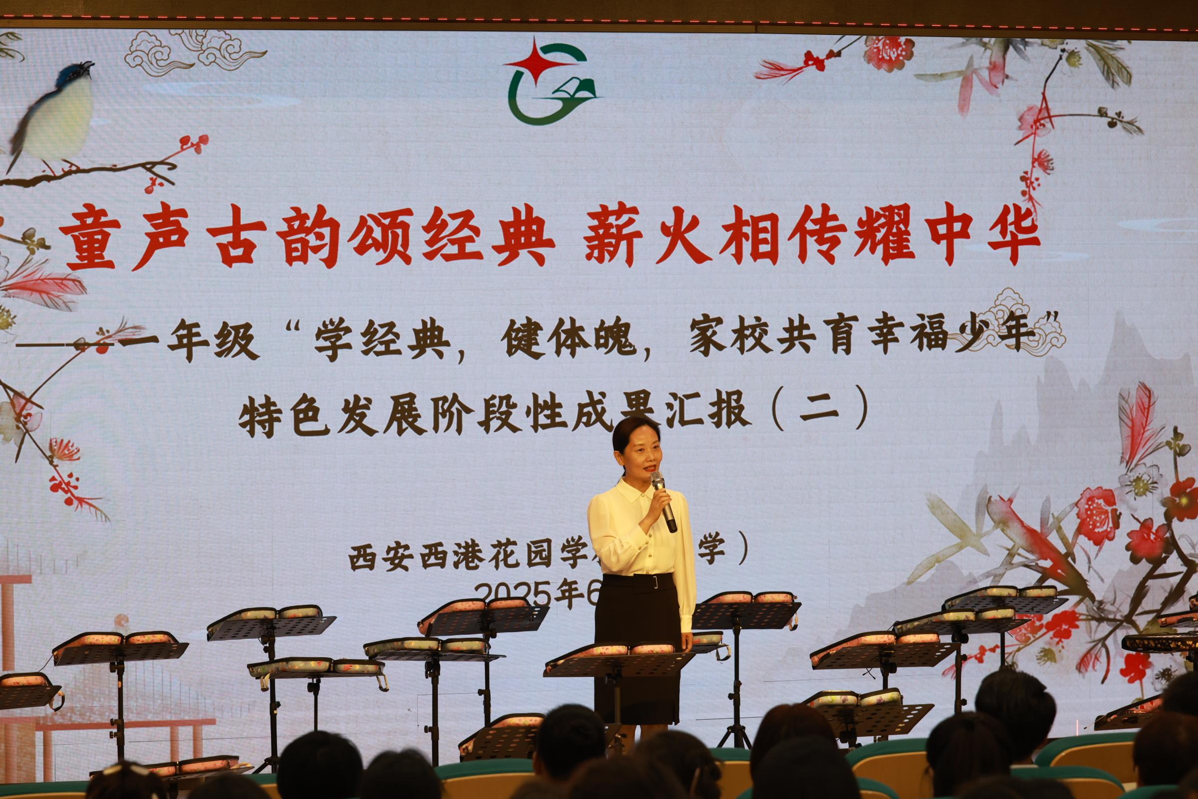活动伊始,西安西港花园学校校长郜君致辞。她介绍了学校的办学理念、环境及丰富的学习生活,并重点回顾了一年来学生在经典诵读中的收获。郜君表示,孩子们在老师引领下,“一字一句读论语,一言一行学做人”,取得了长足的进步。她强调,诵读经典能感受文字力量、领悟先贤智慧,为成长为时代栋梁奠定基础,并肯定了家校社协同育人的重要性。她期待孩子们从诵读中感悟六个方面的智慧光芒。