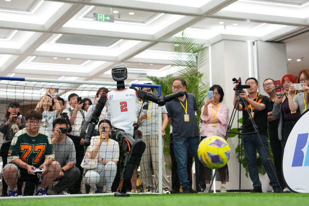在北京市机器人产业园(亦庄)的“机器人大世界”前,“活力中国调研行”记者团最新观看了一场趣味足球赛,比赛双方是来自北京加速进化公司的人形机器人。正是这款机器人,让中国团队在今年3月的RoboCup机器人世界杯德国公开赛上夺得冠军。