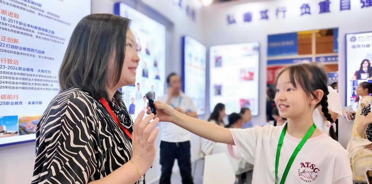 西安市浐灞第三小学三年级七班的三秦学生记者余烜莹对陕文投睿德职业高级中学教学副校长冯斌进行了采访。冯斌向她介绍了学校的办学优势,包括艺术设计、产教融合等内容,以及学校与部分高校开展的合作交流和人才培养模式探索。