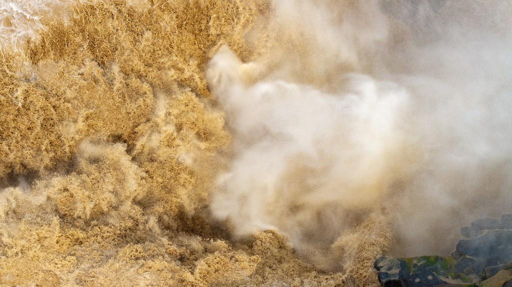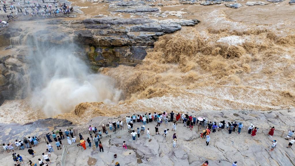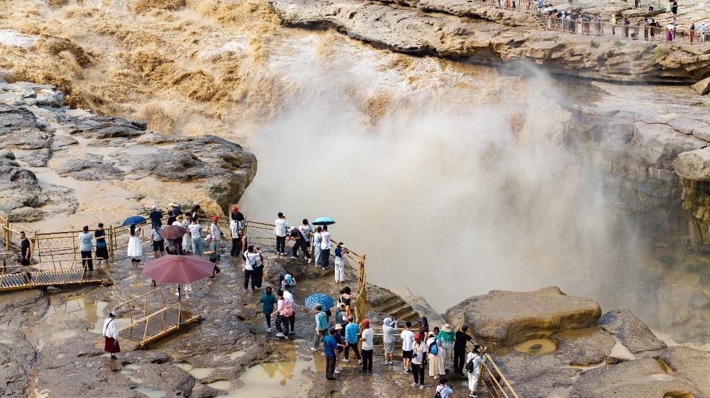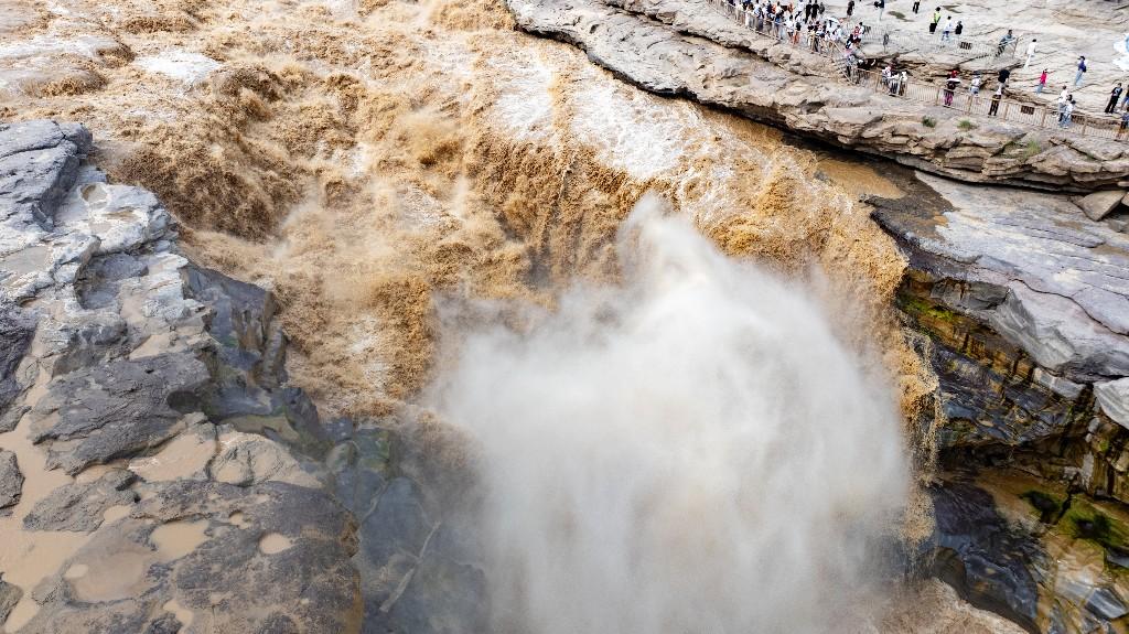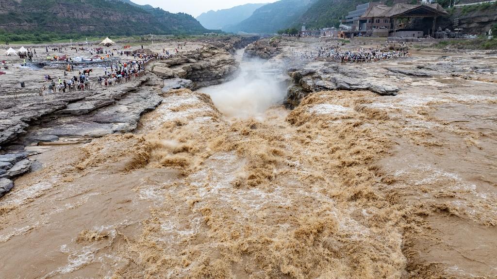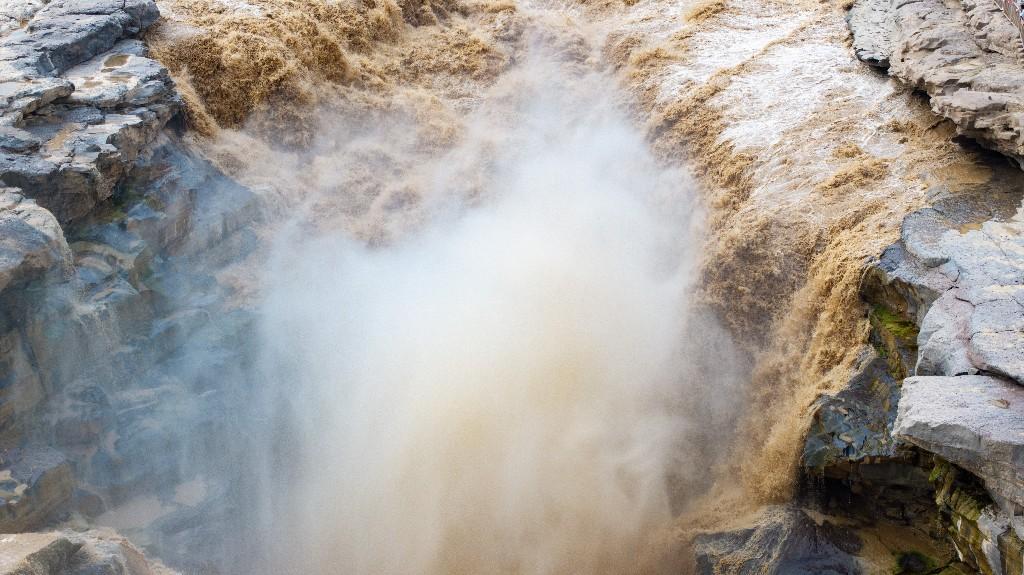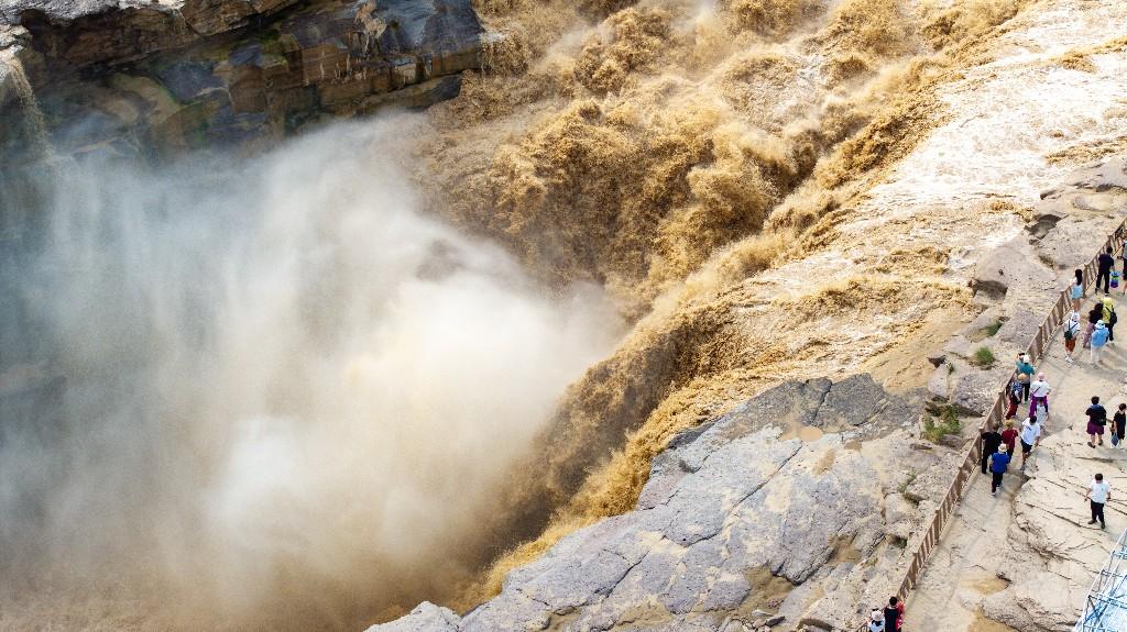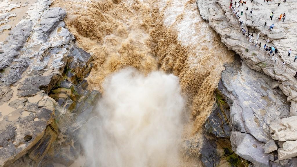 近日,受上游持续强降雨影响,位于陕西宜川的黄河壶口瀑布泥沙含量骤增,原本奔腾咆哮的瀑布呈现出罕见的“金色瀑布”壮丽景观,吸引众多游客和摄影爱好者前来观赏。