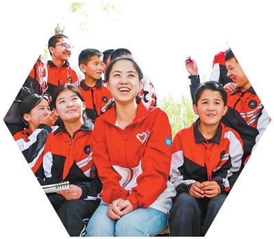 在新疆阿图什市哈拉峻乡谢依特小学,青年支教教师高淑贤和学生们在一起。