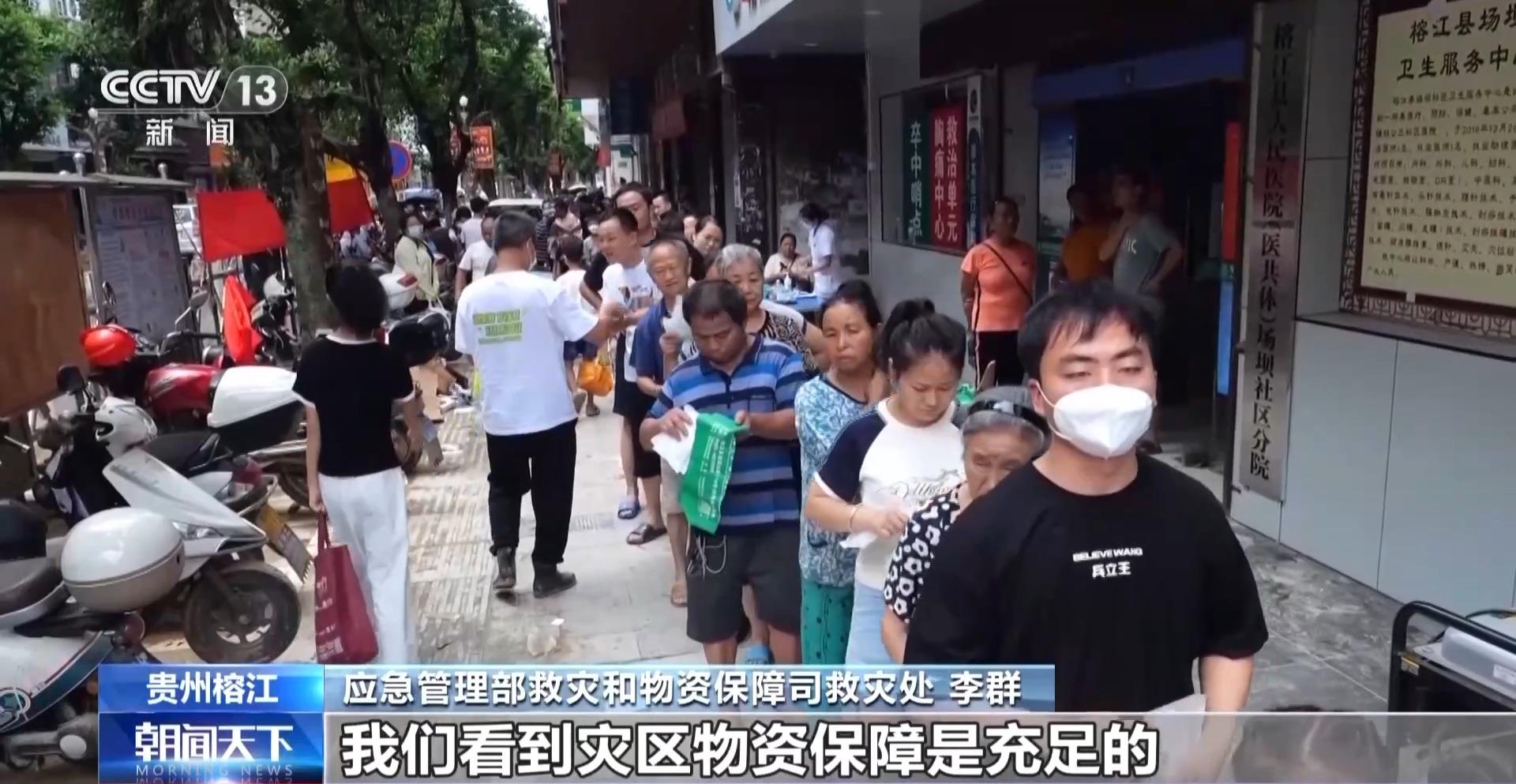 应急管理部救灾和物资保障司救灾处 李群:榕江县城主干道已恢复通行,在物资接收点和发放点看到灾区物资保障是充足的,受灾群众生活逐步恢复,前期应急管理部会同国家粮储局调拨的夏凉被、应急包等中央救灾物资都已经运抵灾区,也正有序发放中。