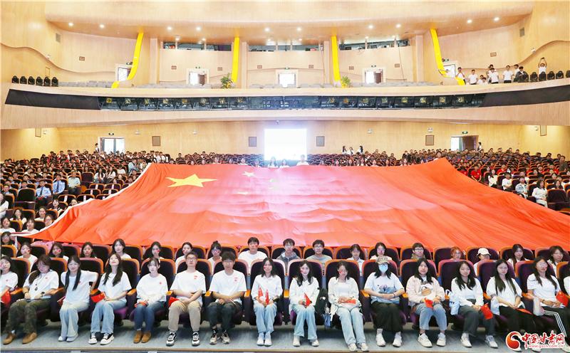伴随着震撼的誓言,一面巨大的五星红旗从会场后方徐徐展开,几乎铺满整个会场,“扎根西部、报效祖国”的豪情与壮志在现场涌动。