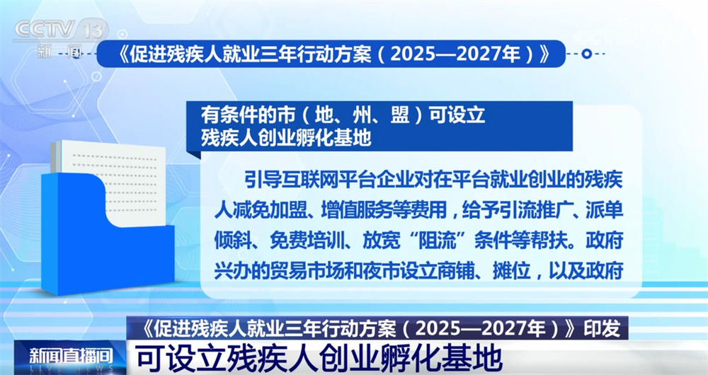 央视网消息:日前,国务院办公厅印发《促进残疾人就业三年行动方案(2025—2027年)》,进一步加强残疾人就业帮扶。