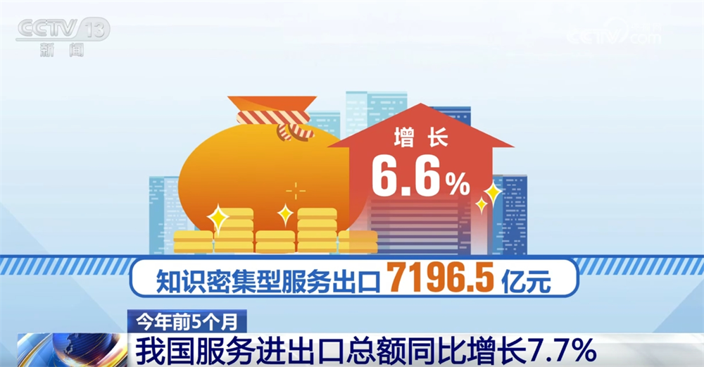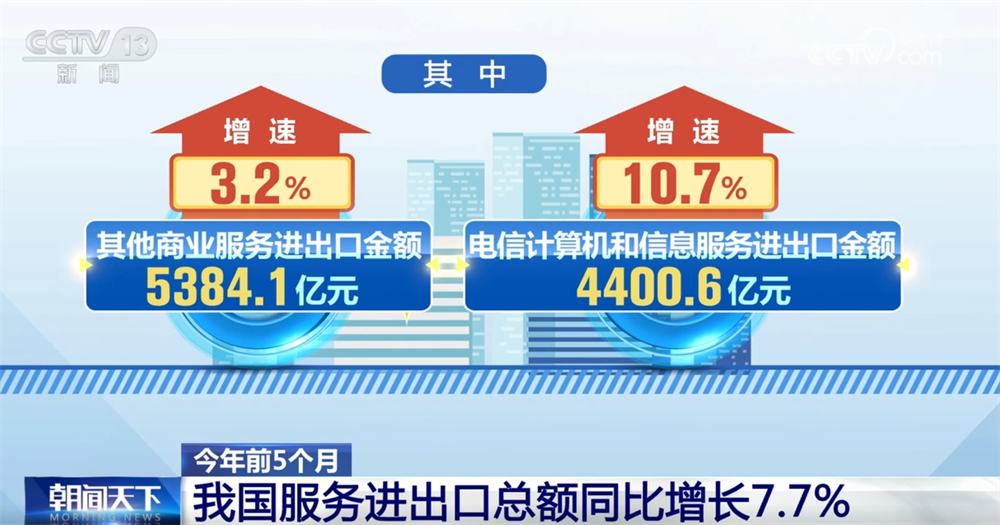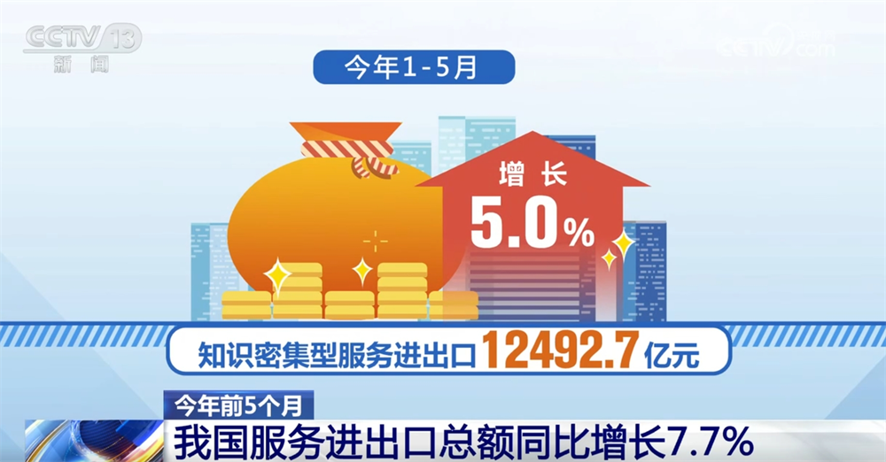 央视网消息:商务部7月3日发布数据,今年前5个月,我国服务贸易稳步增长,服务进出口总额同比增长7.7%。