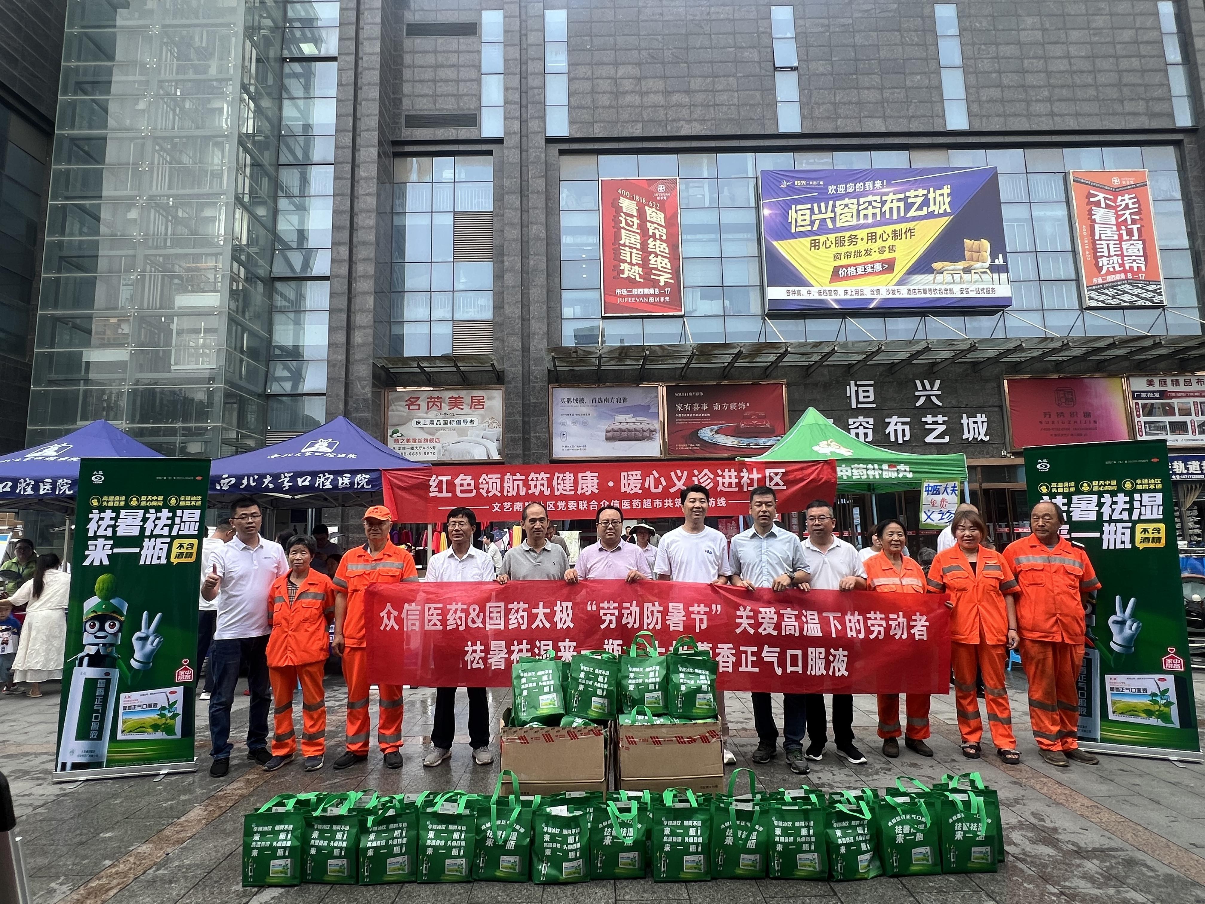 社区党委联合陕西众信医药超市连锁股份有限公司西安六分店为西安瑞康环卫物业服务有限公司碑林分公司的部分保洁员提供了防暑爱心礼包,对保洁员的辛勤付出表示感谢,叮嘱他们在高温环境要弹性调整工作时间,注意防暑降温,确保自身健康和安全。