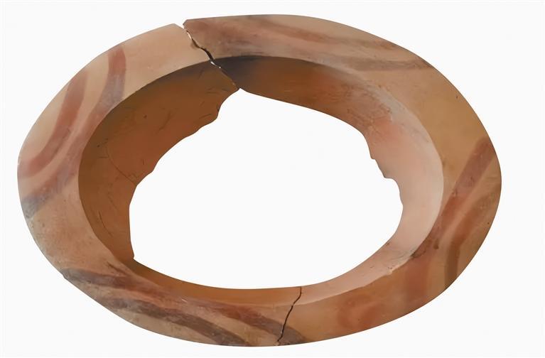 这件红陶宽沿彩陶盆表面磨光,沿部用颜料彩绘了4组双弧线,盆口径41厘米,沿宽5厘米,残高10厘米,底部残。经过考古人员深入研究分析,初步认定彩陶盆发现地是一处仰韶文化庙底沟类型的中晚期遗址。整个遗址范围较广,东西长约100米,西侧与村庄叠压,南北长约100米。地面上可采集到零星的陶片,考古队员在断崖边缘发现4个清晰的灰坑。这次发现的红陶宽沿彩陶盆尤为引人注目,为深入了解渭南地区的史前文化分布格局提供了宝贵的实物证据。