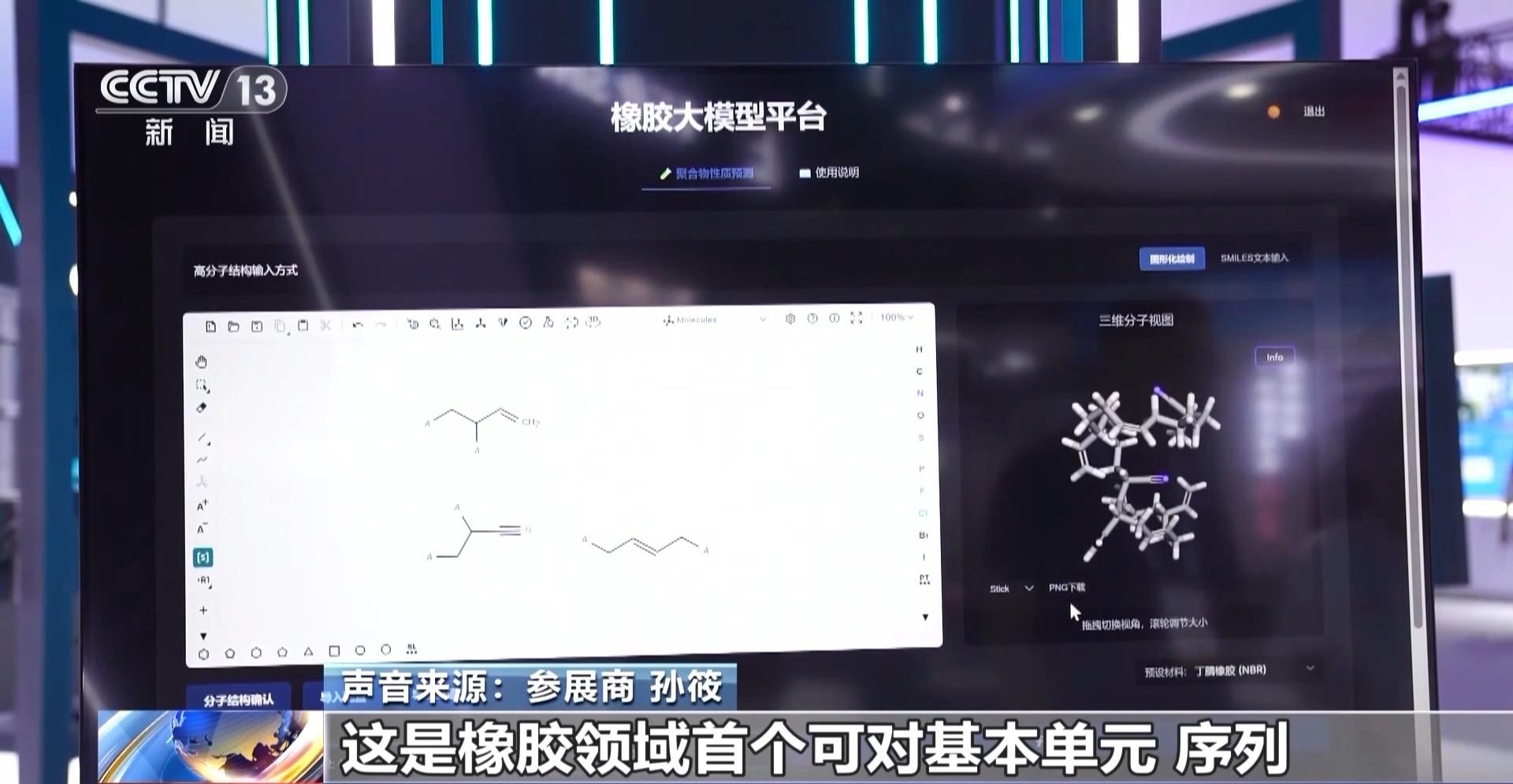 参展商 孙筱:这是橡胶领域首个可对基本单元、序列、分子量等结构进行设计与预测的大模型。用户可以根据对橡胶组分和特性的要求,进行精准的分子结构设计和配方性能预测,帮助科研人员提升研发效率,降低试错成本。